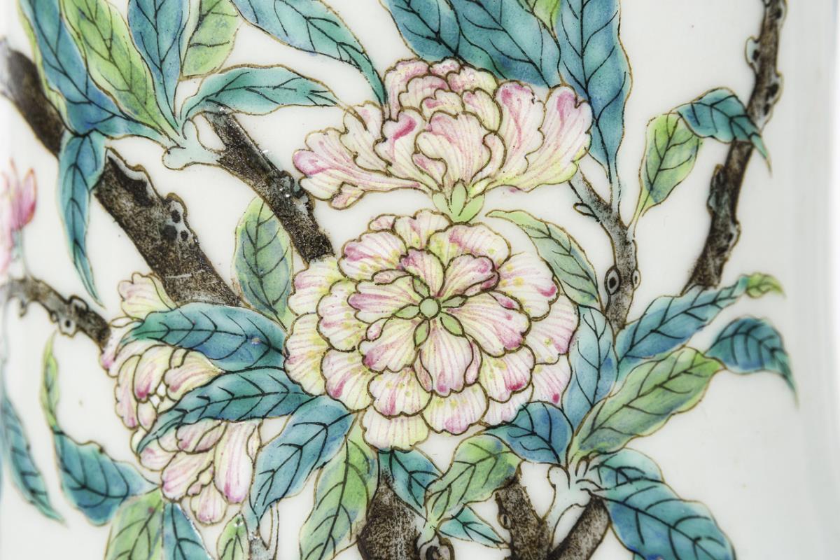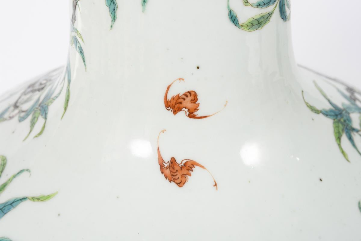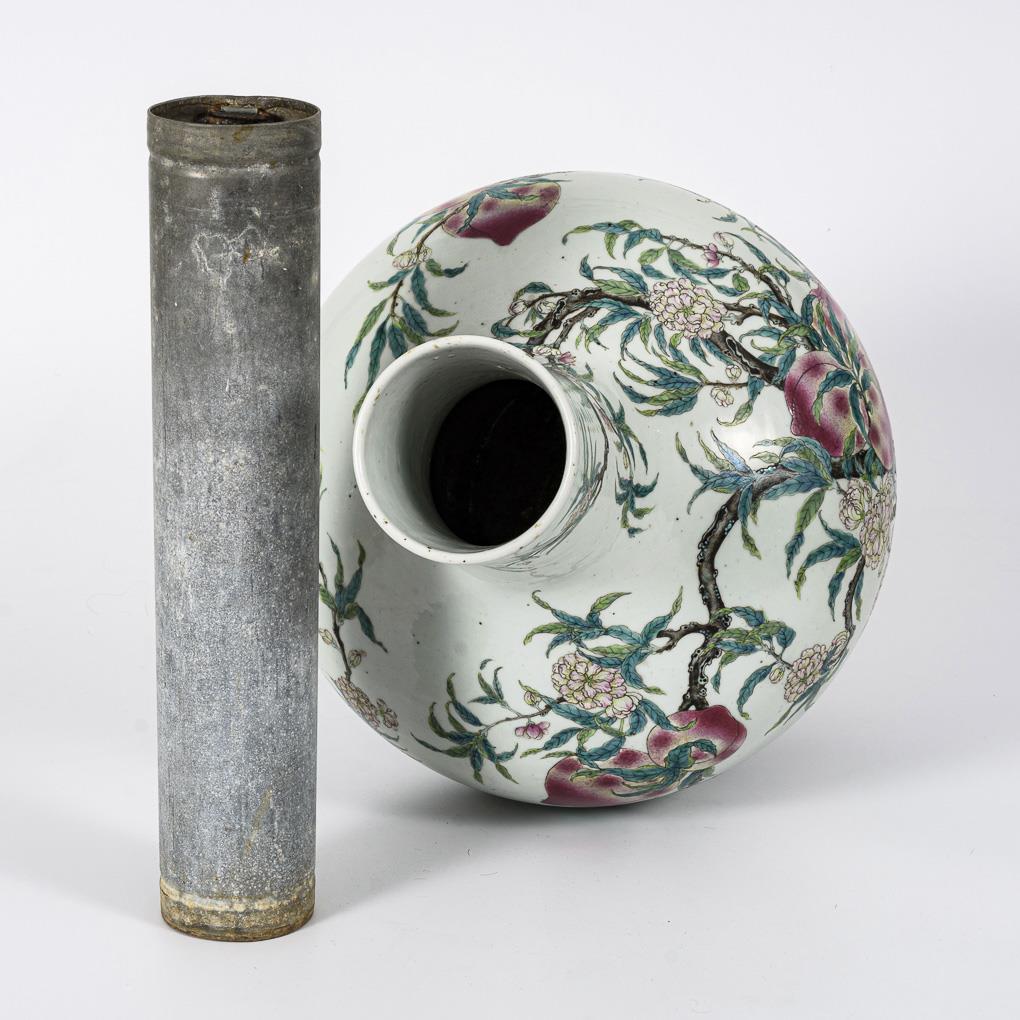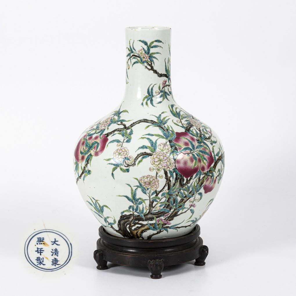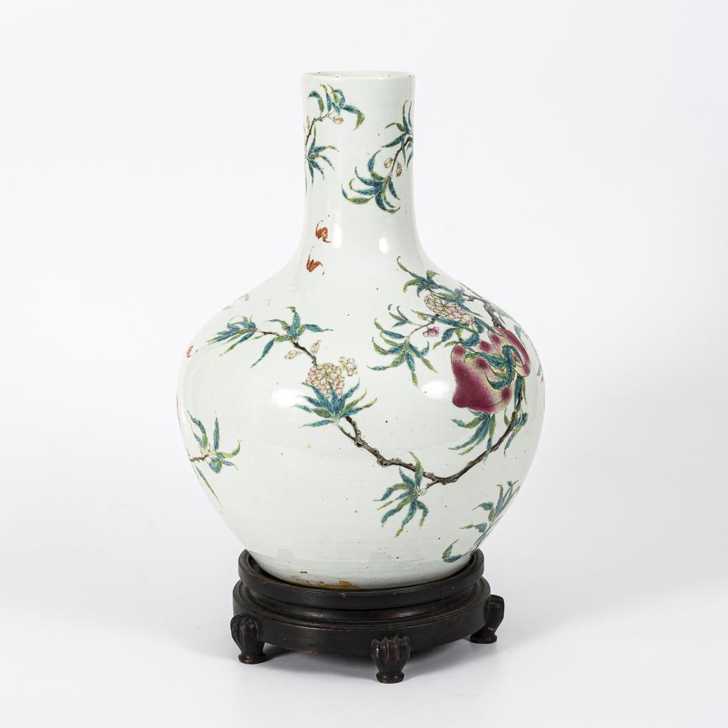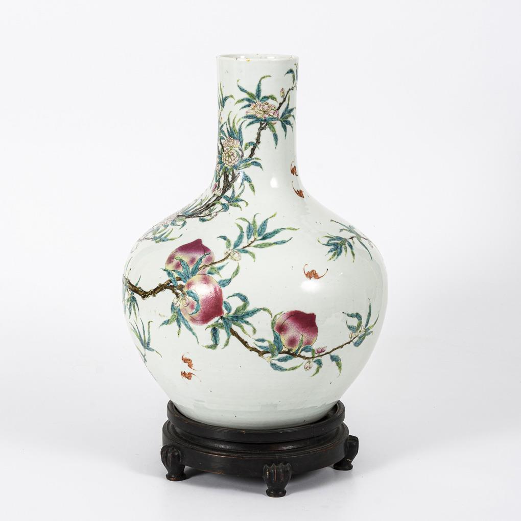 Sehr bauchige Vase mit exzellenter Bemalung. Aus einem Stamm sprießende Zweige mit neun reifen Pfirsichen, Pfirsichblüten, Knospen und Blättern. Dazwischen fünf kleine Fledermäuse. Beides Symbole für langes Leben und Abwehr von Dämonen. Metalleinsatz für Blumen und Holzsockel. Haarriss-Spinne am Boden. Kleiner Ascheanflug in der Glasur.