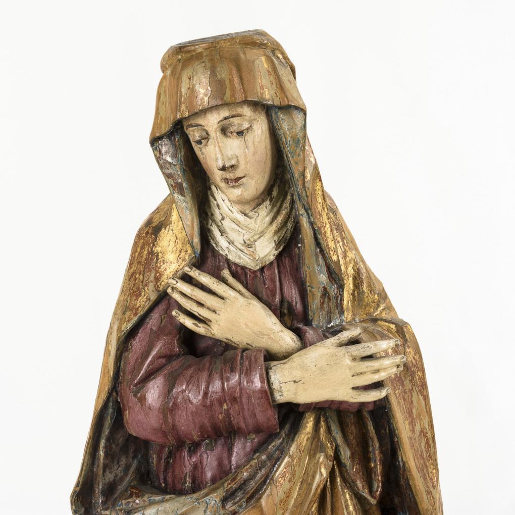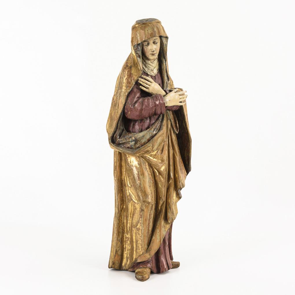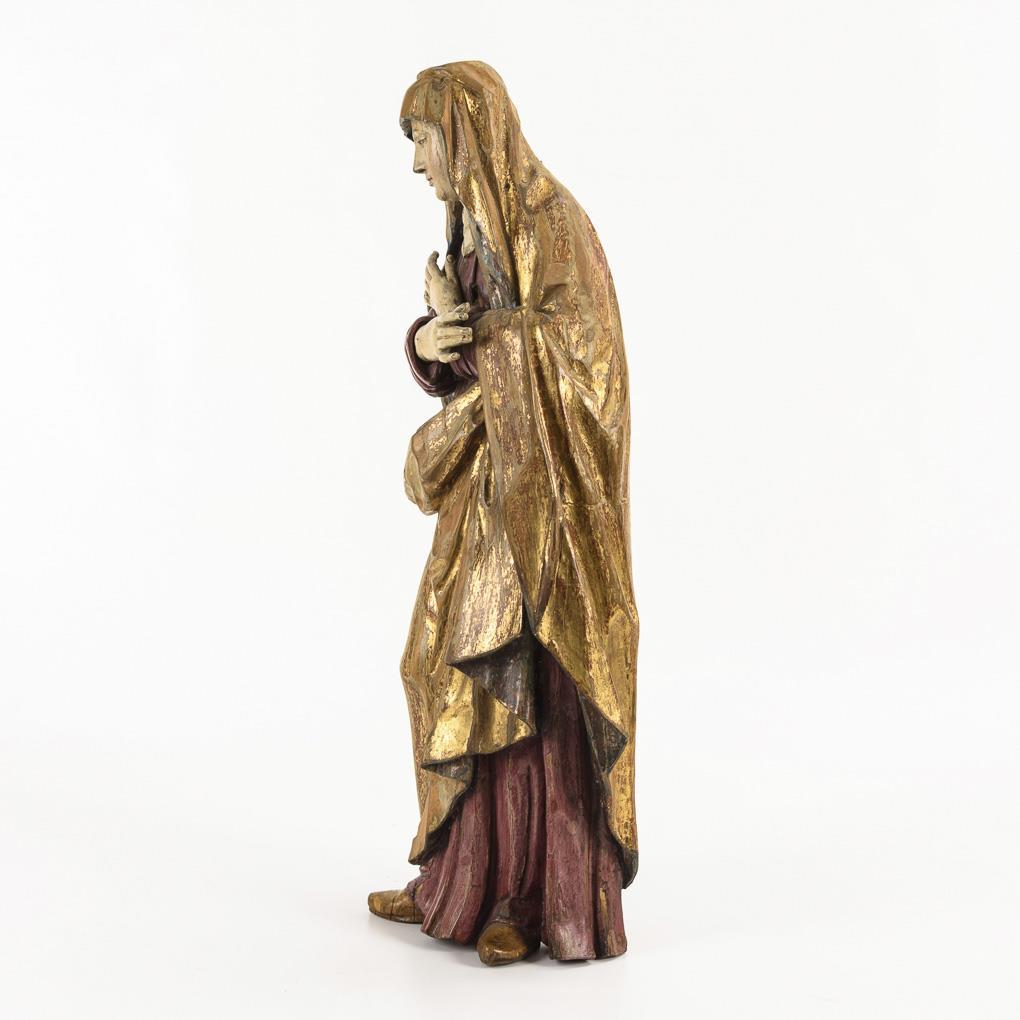 Standfigur der Maria mit gekreuzten Armen vor der Brust nach dem Gnadenbild in der Herzogspitalkirche München. Krone fehlt, Schäden an der übergangenen Fassung, Trockenrisse zumeist rückseitig.