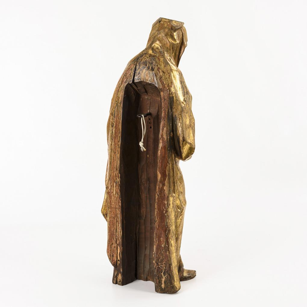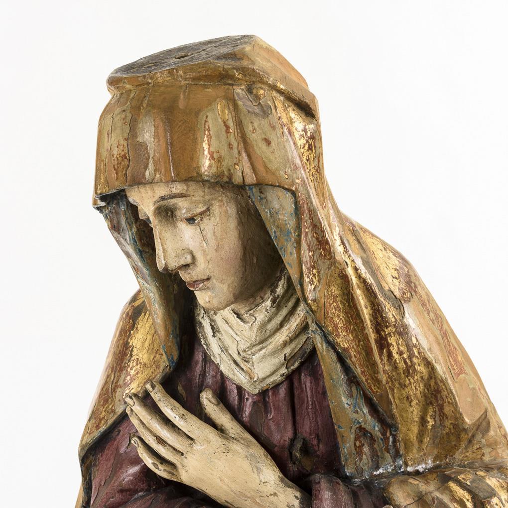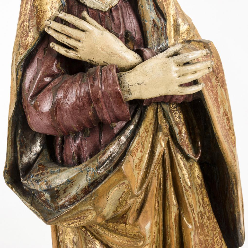 Standfigur der Maria mit gekreuzten Armen vor der Brust nach dem Gnadenbild in der Herzogspitalkirche München. Krone fehlt, Schäden an der übergangenen Fassung, Trockenrisse zumeist rückseitig.