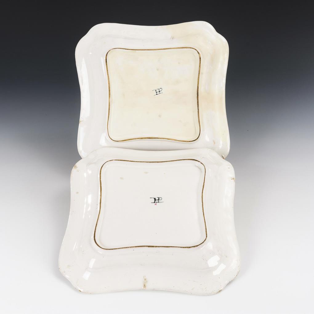 Quadratische Schalen mit konkaven Rändern, teils reliefiert. Gewölbt-gebuckelte Deckel mit Fruchtknauf. Purpurmalerei mit Architektur und Blumenzweigen. 1 Schale restauriert, partiell Risse und Bestoßungen.