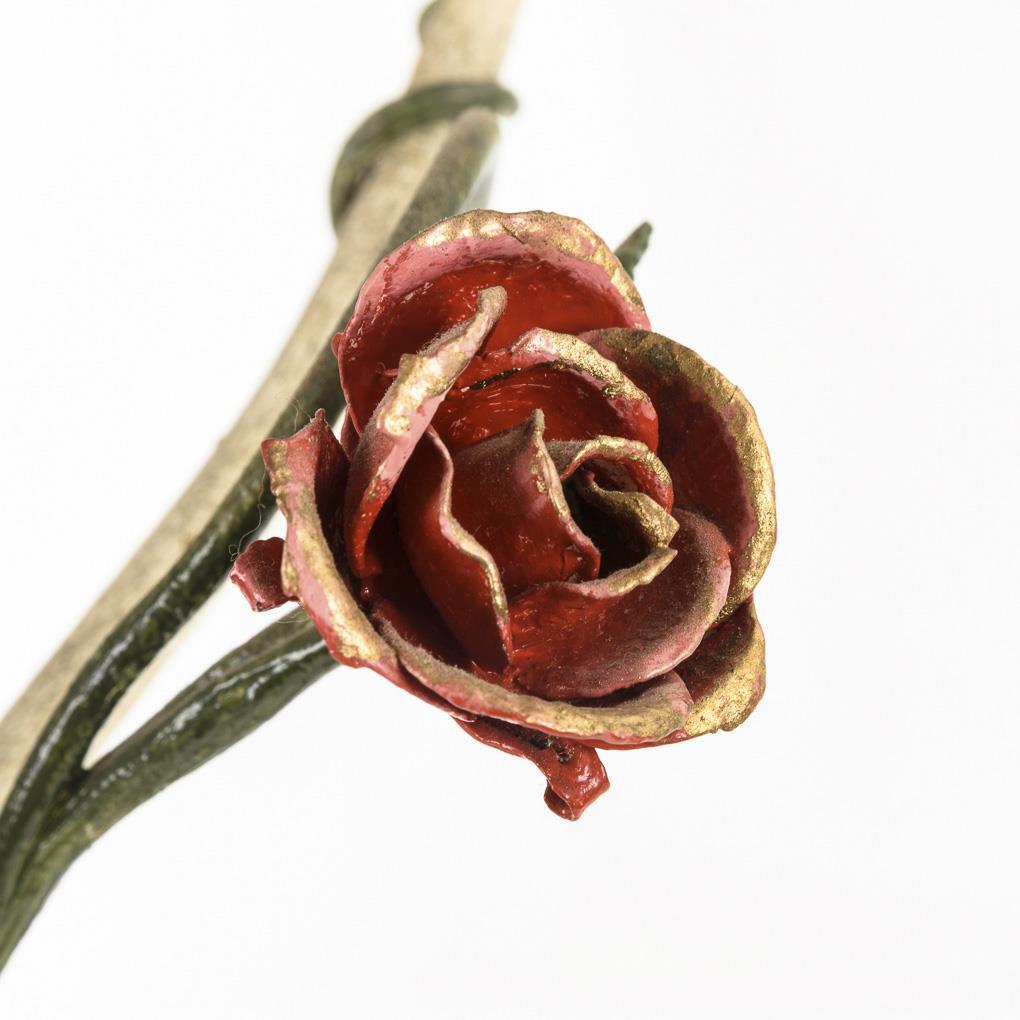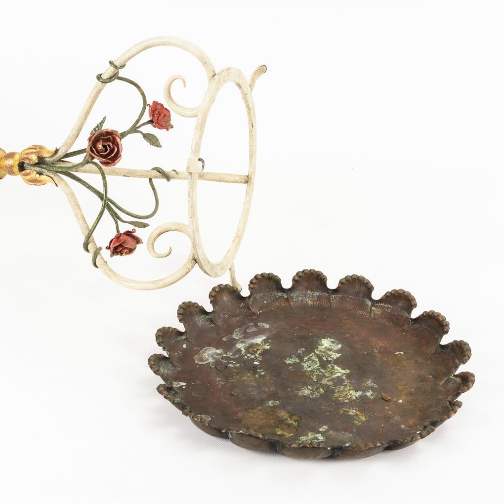 Schmiedeeisen bemalt, teils goldbronziert. Kupferschale getrieben und gepunzt. H 78 cm, Ø Schale 35 cm.