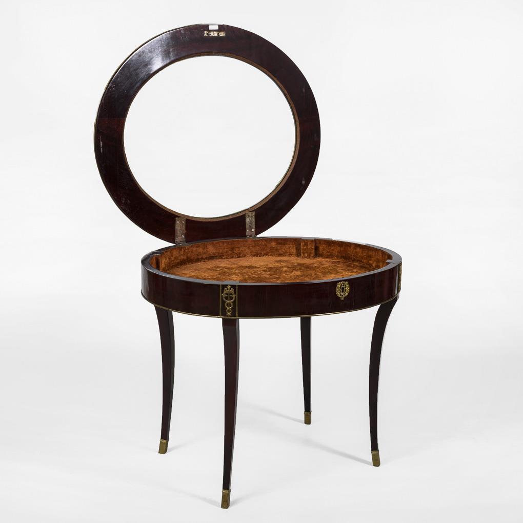 Schlicht-eleganter ovaler Salontisch im klassizistischen Stil mit verglaster, klappbarer Deckplatte und mit Samt ausgekleidetem Staufach, auf 4 Säbelbeinen; dezent dekoriert mit Messingbeschlägen als Äskulapstab und Messingbändern. Verschließbar. Alters-/Gebrauchsspuren, Trockenrisse.