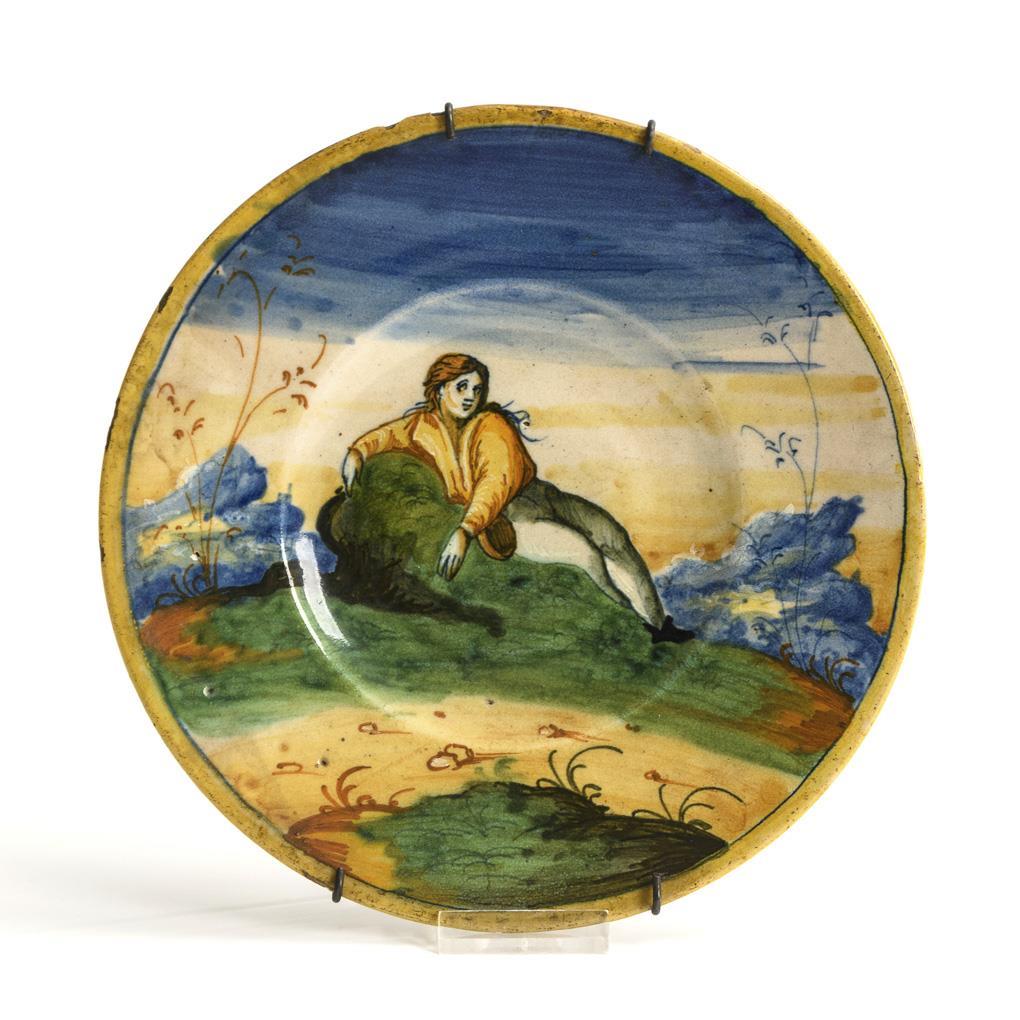Auf einem Grashügel lagernder Jüngling in Landschaft. Mit Wandhalterung. Leichte Randbestoßungen und Bereibungen.