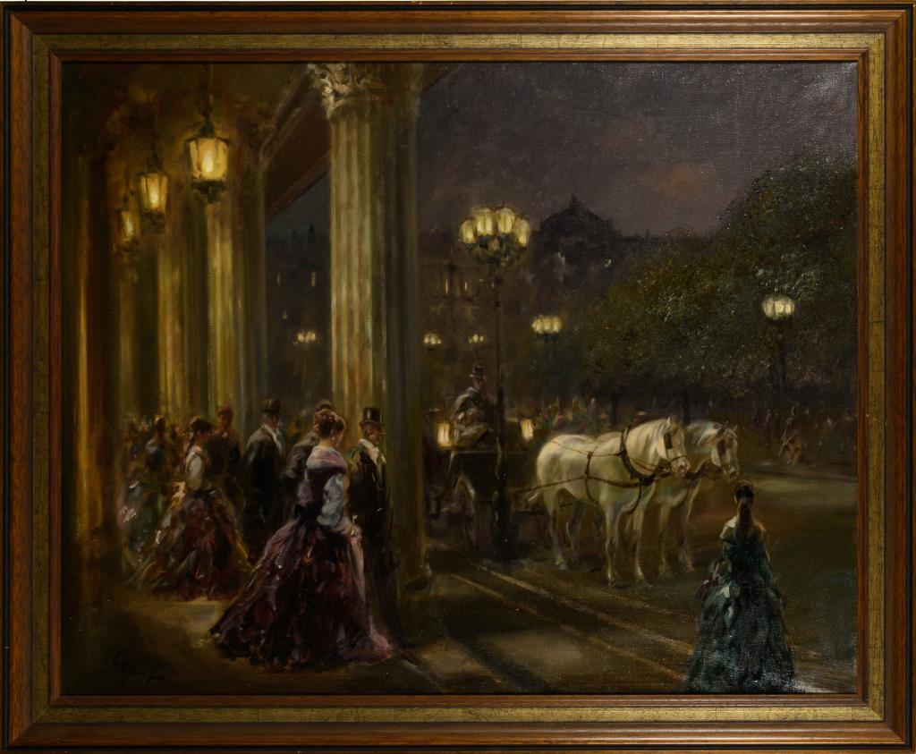 Feine Gesellschaft in der Mode um 1900 beim Austritt aus einem öffentlichen Gebäude.
