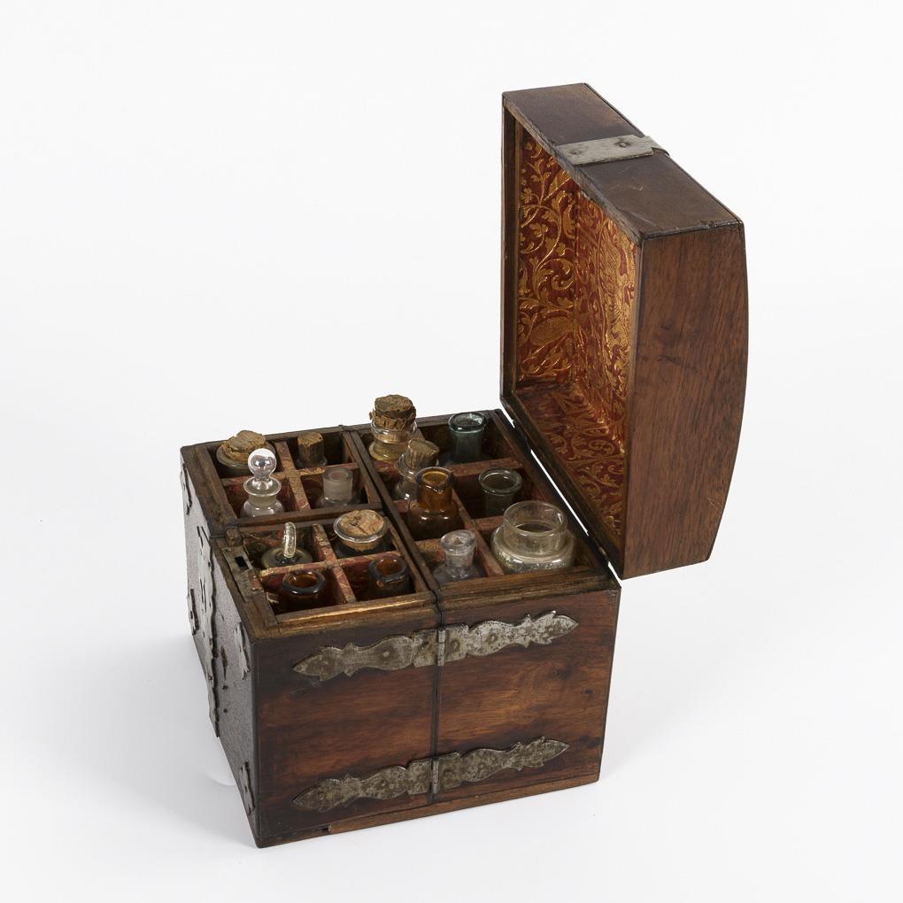 Nussbaum furniert, teils massiv, innen mit rot-goldenem Luxuspapier (mit dem Wappen) ausgeschlagen, 15 Glasflaschen teils mit Inhalt. 16,5 x 16,5 x 16,5 cm.