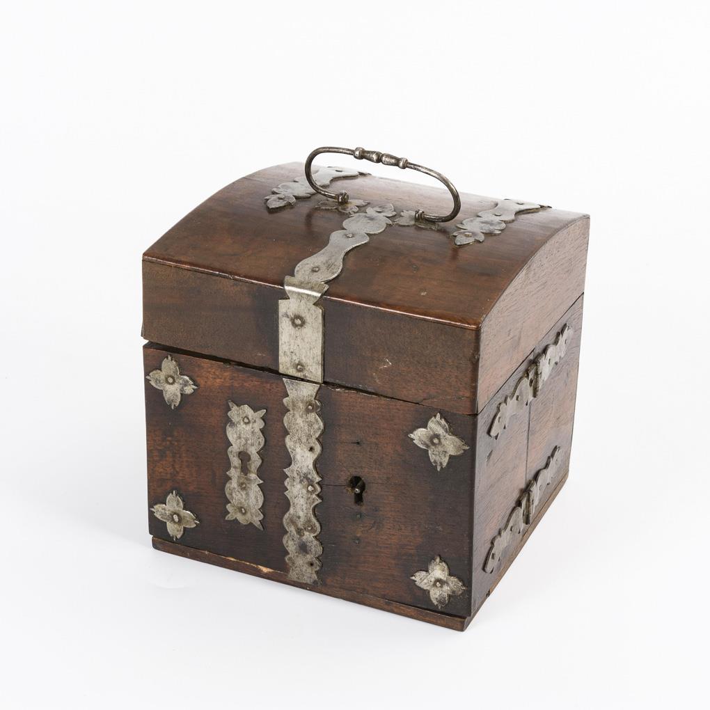 Würfelkorpus mit leicht gerundetem Scharnierdeckel. Geschweifte Eisenbeschläge und Tragegriff. Die aufklappbaren Fronttüren ergeben eine gestufte Schubfront; darüber Fachungen für die Flaschen. Teils Ergänzungen, Alters-/Gebrauchsspuren, Schlüssel fehlt.