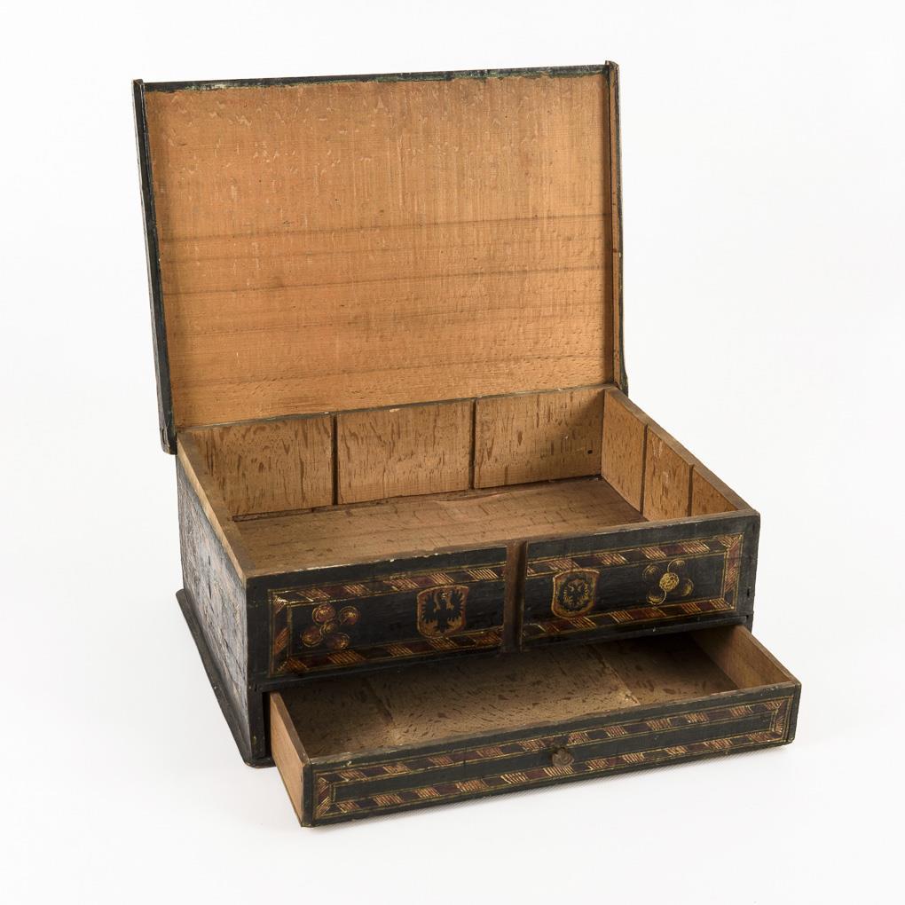 Quaderkorpus mit Schub in der unteren Frontzone sowie Deckel mit Holzscharnier. Allseits und auf dem Deckel scheinkassettiert und mit ornamentalen Blumen verziert. Zusätzlich auf dem Deckel zentrale Blumenvase, in der Front Wappen mit Adler bzw. Doppeladler; auf der Rückseite Handtreue über einem Herz (Minnekästchen). Mittelleiste der Front fehlt, Innenfachungen fehlen, Alters-/Gebrauchsspuren.