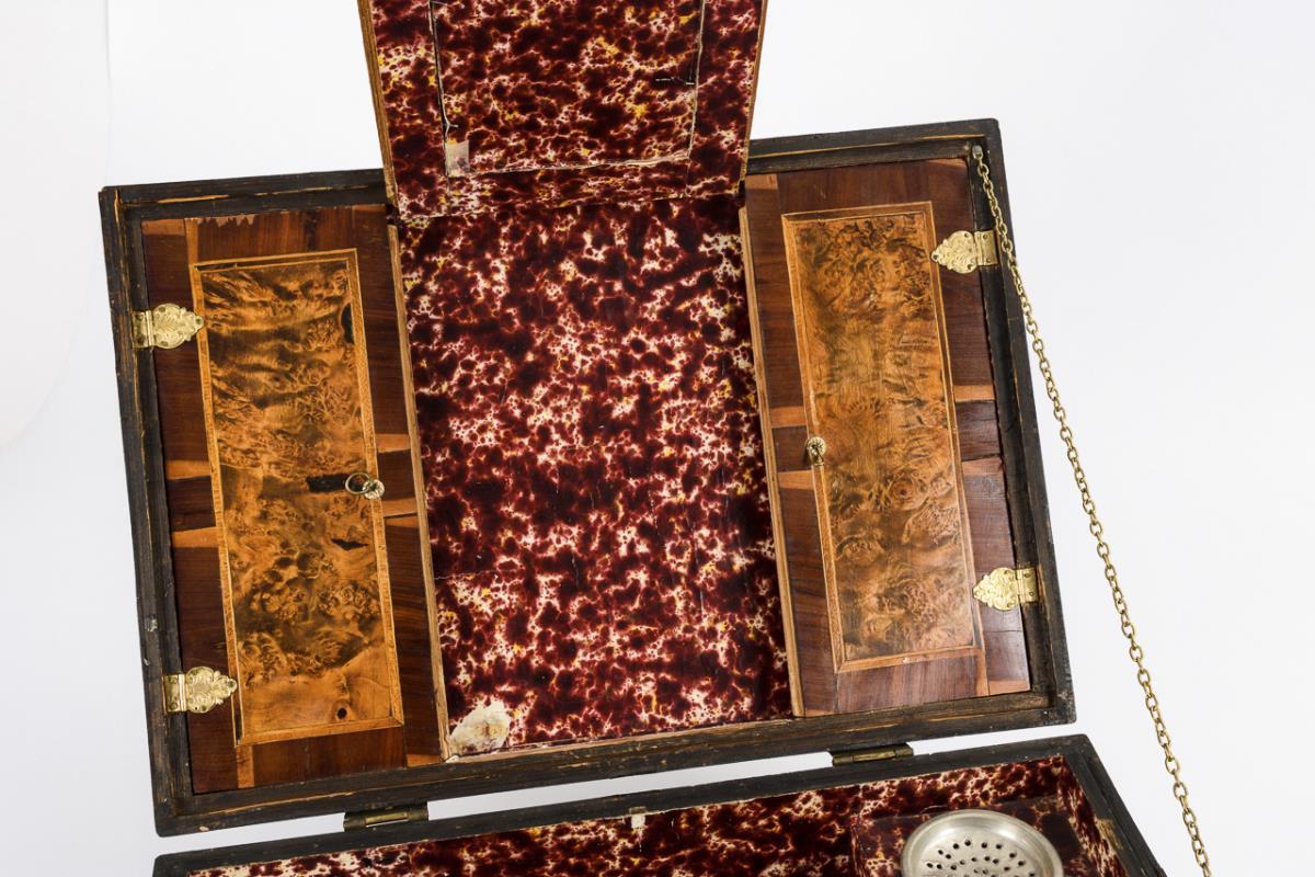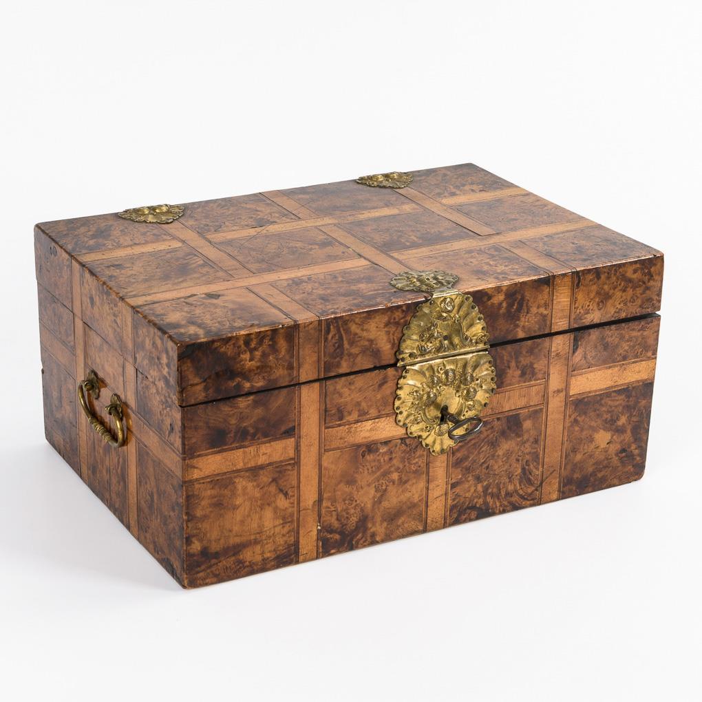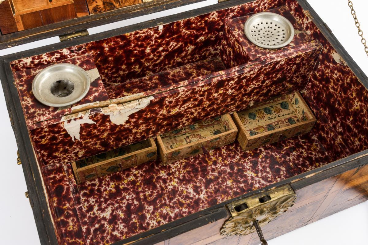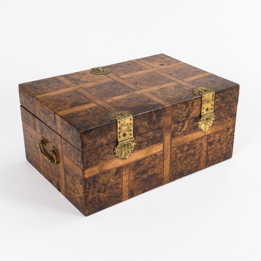 Quaderschatulle mit getriebenen Messingbeschlägen und seitlichen Tragegriffen sowie allseits und auf dem Scharnierdeckel Quadrat-Scheinkassetten mit Band- und Fadeneinlagen. Im Deckel ähnlich furnierte Tür mit Spiegel zwischen 2 Türen. Korpus innen mit rotem Marmorpapier ausgeschlagen. 2 ungemarkte Zinneinsätze für Streusand und Tinte, 4 erhaltene Dosen mit gleichartigem Furnierbild auf den Passdeckeln wie außen. Unter dem doppelten Boden Fach mit 3 Schüben. Minimale Fehlstellen und Trockenrisse, Marmorpapier und Zinneinsätze jünger, einige Alters-/Gebrauchsspuren.