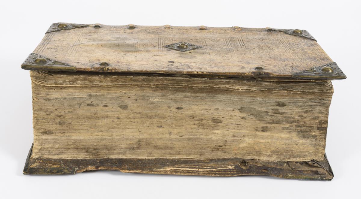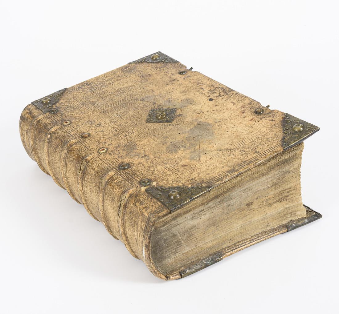 Titelkupfer, Titelblatt, (90), 1181, (23) Seiten. Mit 9 von 11 Abbildungen der Kurfürsten und Luthers. Geprägter Pergamenteinband mit Messingecken. Altersgemäße Gebrauchsspuren, Schließen fehlen, Vorsatz fehlt, erste und letzte Seiten mit stärkeren Beschädigungen.