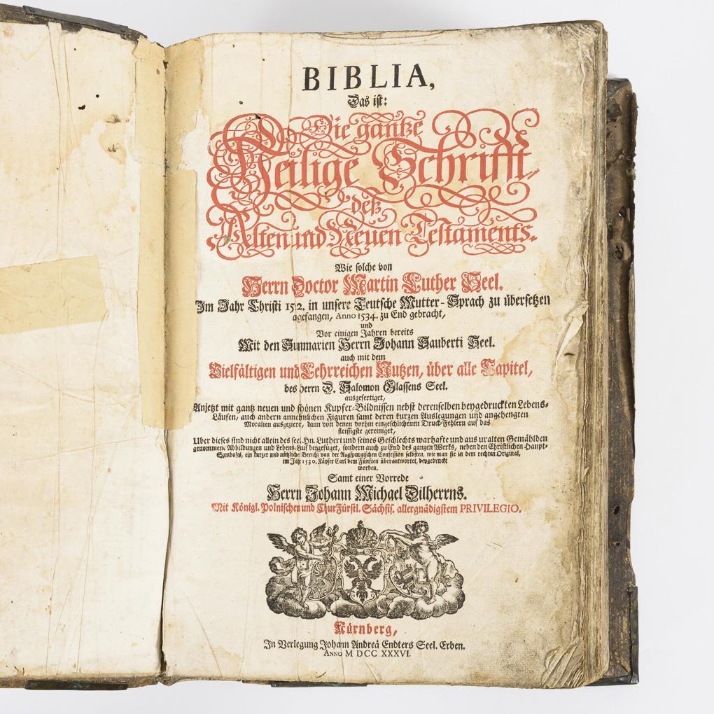 "Biblia, Das ist: Die gantze Heilige Schrifft deß Alten und Neuen Testaments. Wie solche von Herrn Doctor Martin Luther Seel. Im Jahr Christi 1522 in unsere Deutsche Mutter-Sprach ... gebracht und vor einigen Jahren bereits Mit den Summarien Herrn Johann Sauberti Seel. ... Samt einer Vorrede Herrn Johann Michael Dilherrns".
