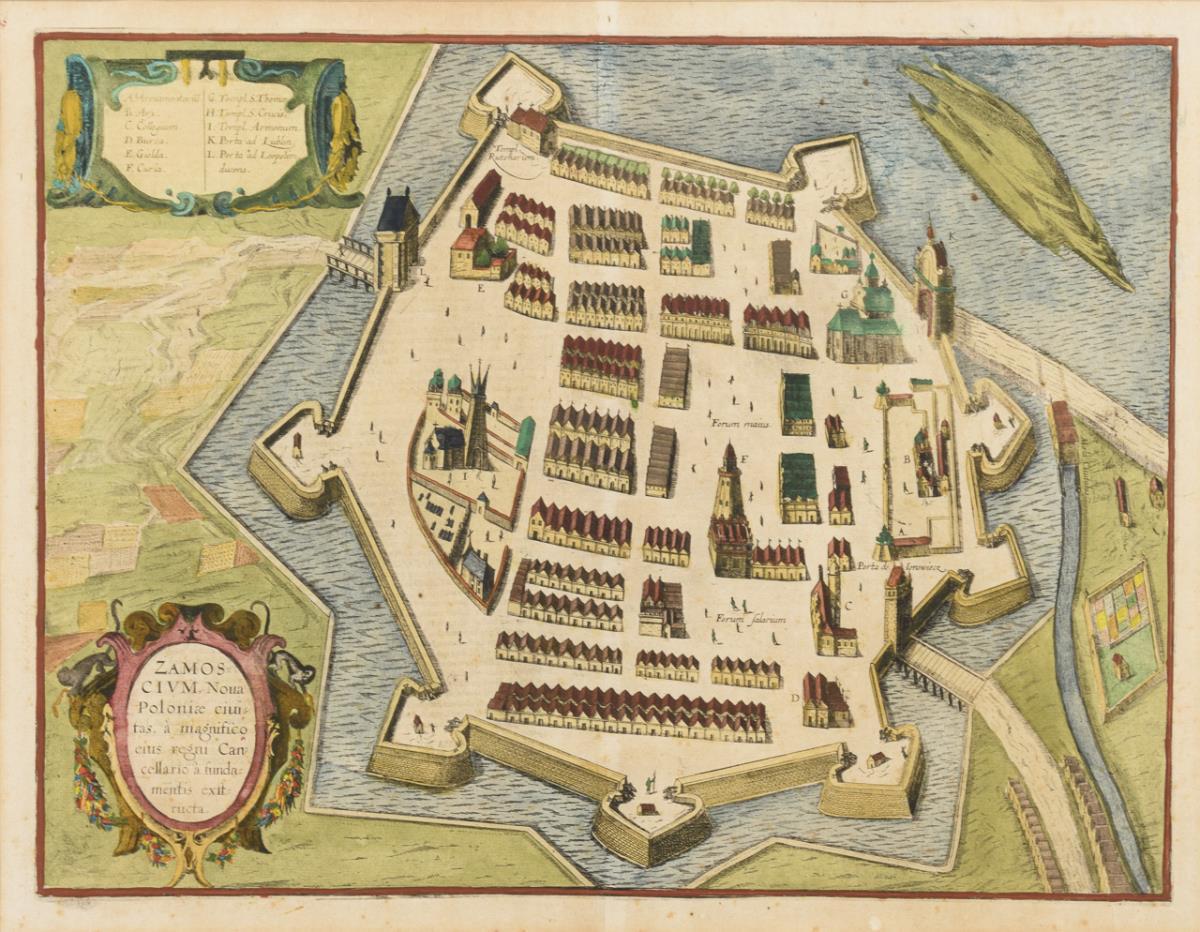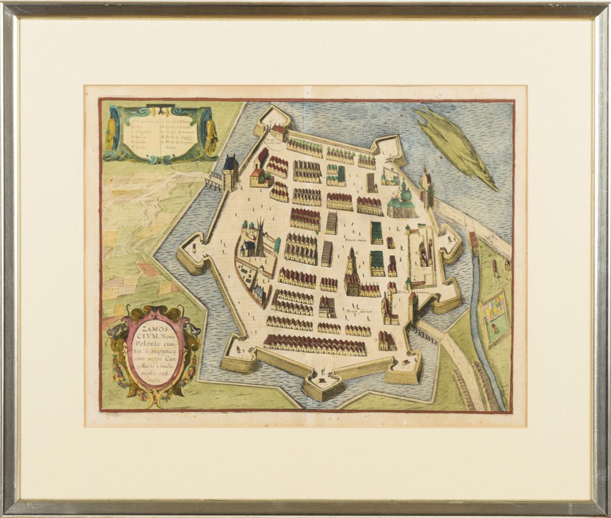 Dekorative vogelperspektivische Darstellung der Stadt Zamość innerhalb der Stadtmauern, mit Titelkartusche "Zamoscivm Noua Poloniae [...]" und Legende, aus "Civitates Orbis Terrarum", 1572 - 1618. Bugfalte, etwas stockfleckig.
