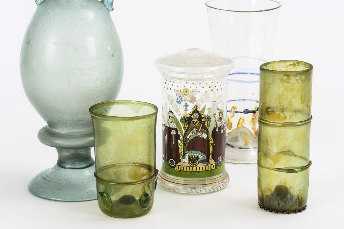 1 Vase aus grünlichem Glas mit zwei Henkeln (H 27,5 cm). / Konisches Glas mit blauer Fadenspirale und aufgeschmolzenen Opalglastropfen (H 16,5 cm). / Kurfüstenglas mit Deckel und Druckdekor (H 13 cm) / 2 Becher aus Waldglas mit Fadenspirale und 1x mit vier aufgeschmolzenen Tropfen ( 13 und 9,5 cm). Knauf des Kurfürstenglases fehlt, 1 unterer Henkelansatz der Vase fehlt, Fadenspiralen an den grünen Gläsern defekt.