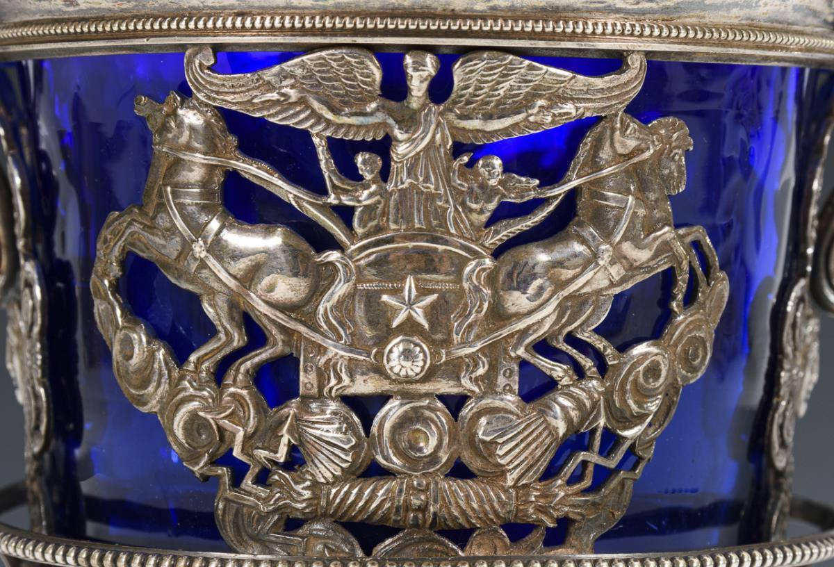 Elegant durchbrochenes Gefäß mit Siegesgöttin auf Quadriga und Tierkopfhenkeln. Seitlich Halterungen für 12 Löffel. Ergänzter Glaseinsatz mit Randchips, Fußansatz mit Lötspuren.