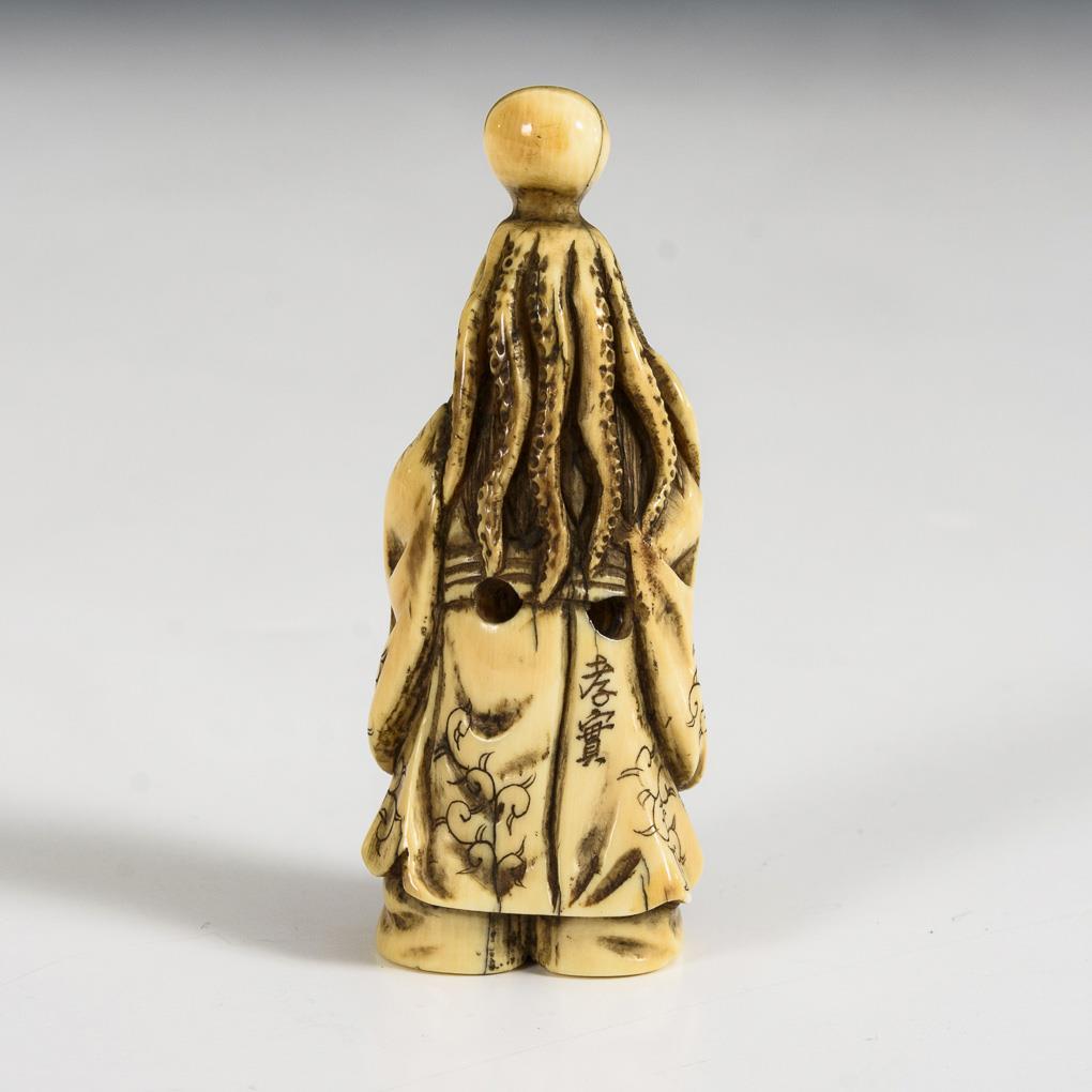 Elfenbein - Netsuke Mann mit Tintenfisch auf dem Kopf.
