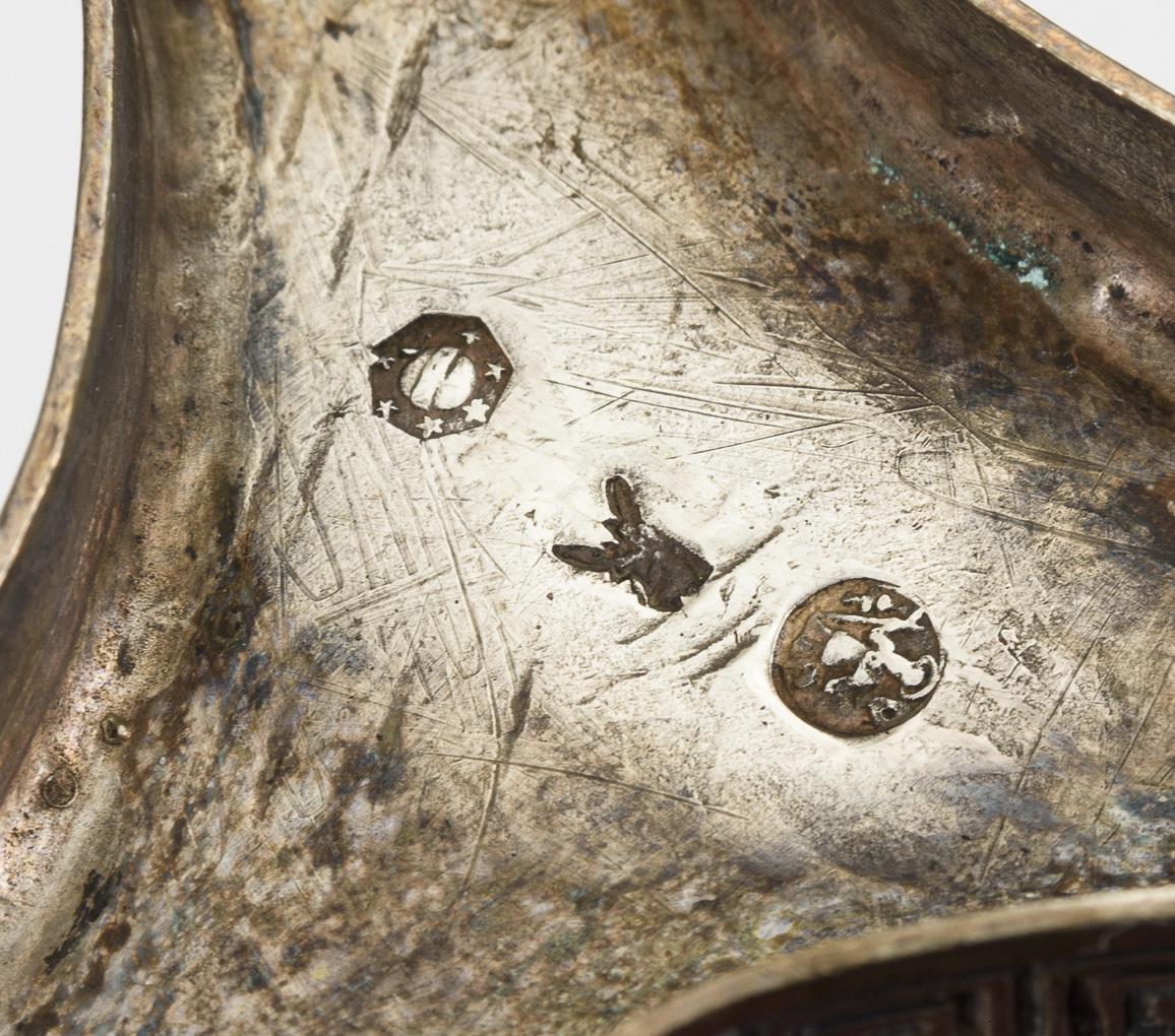 Dreifuß mit Blütenreliefs und Mäanderband. An einem Bein datiert: "3. Juli 1854". Gewölbter Deckel wohl ergänzt (ungepunzt, Silber geprüft). Altersspuren und Defekte.