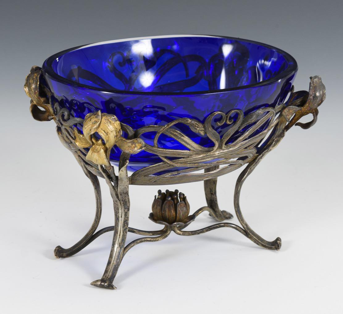Floral geschwungene Schalenhalterung mit Irisblüten und Seerose. 1 Blüte lose eingesteckt.
