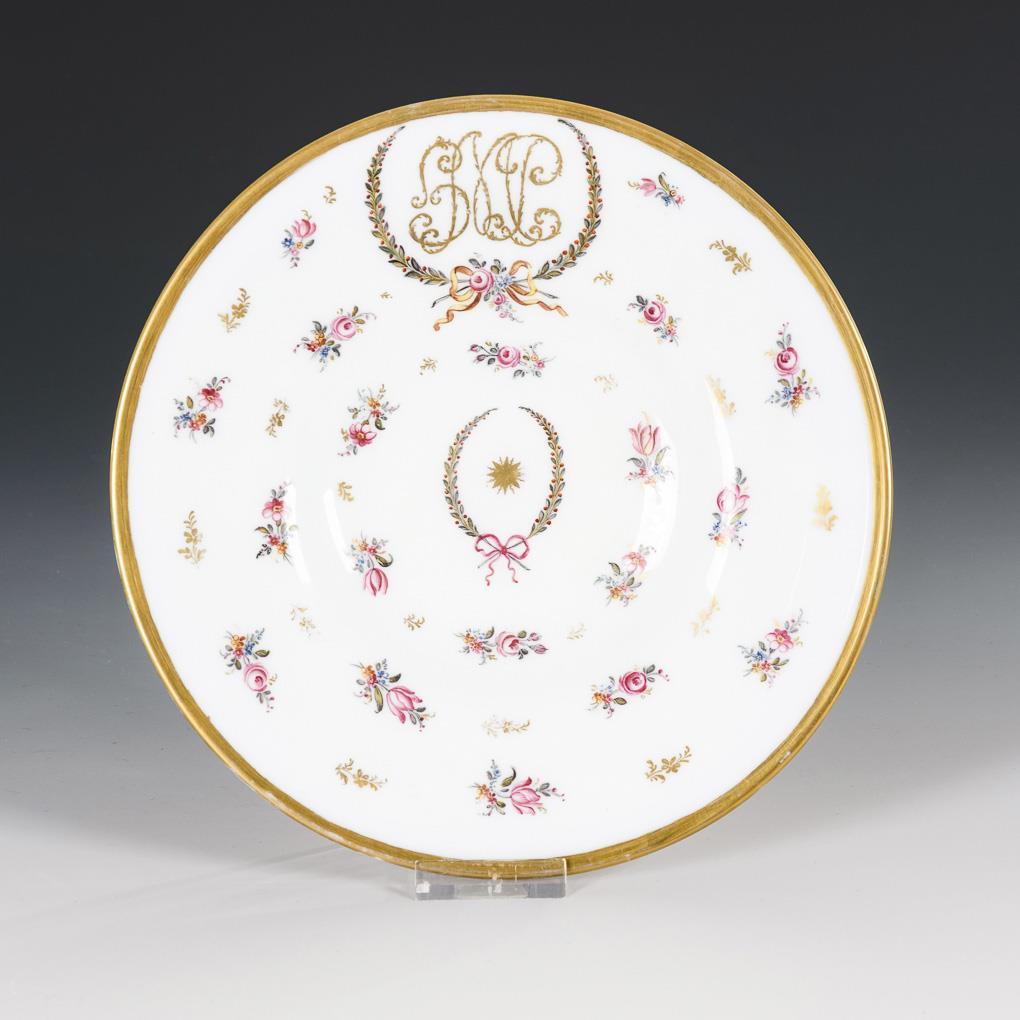 Mit sehr fein gemalten kleinen Blumensträußen und goldenen Blumenstängeln, auf der Fahne das lorbeerumkränzte, ligierte Monogramm "HMP".