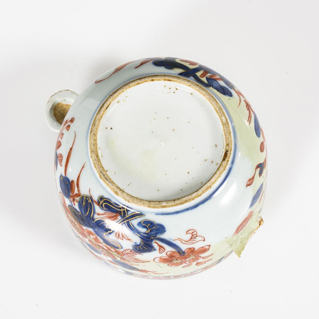 Schüssel mit zwei Handhaben und flacher Deckel im klassischen Imaridekor. Schüssel komplett restauriert, Lackierung nachgedunkelt. Eine Handhabe abgebrochen, aber vorhanden. Deckel unbeschädigt.
