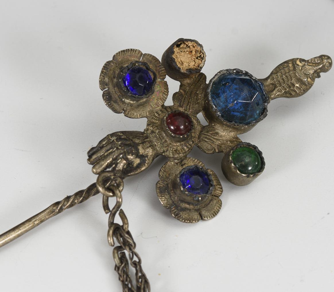 Fisch mit roten Glasaugen. / Anstecknadel mit Farbsteinen sowie Geier und Hand, daran 2 Ketten mit kleineren Fischen. Altersspuren, 1 Glasstein fehlt.