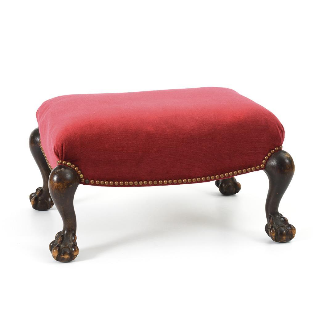 Gepolsterte Fußbank mit 4 Greifenbeinen; roter Samtbezug mit Ziernagelung. Alters-/Gebrauchsspuren, Polster und Bezug ergänzt.