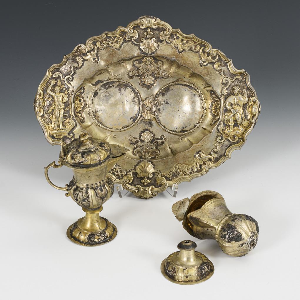 Kännchen für Wasser und Wein, auf reich reliefiertem Tablett mit 2 Heiligendarstellungen. Mit starken Defekten und zahlreichen alten Reparaturen, 1 Fuß lose anbei.