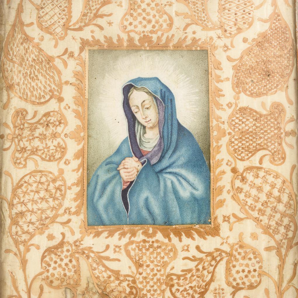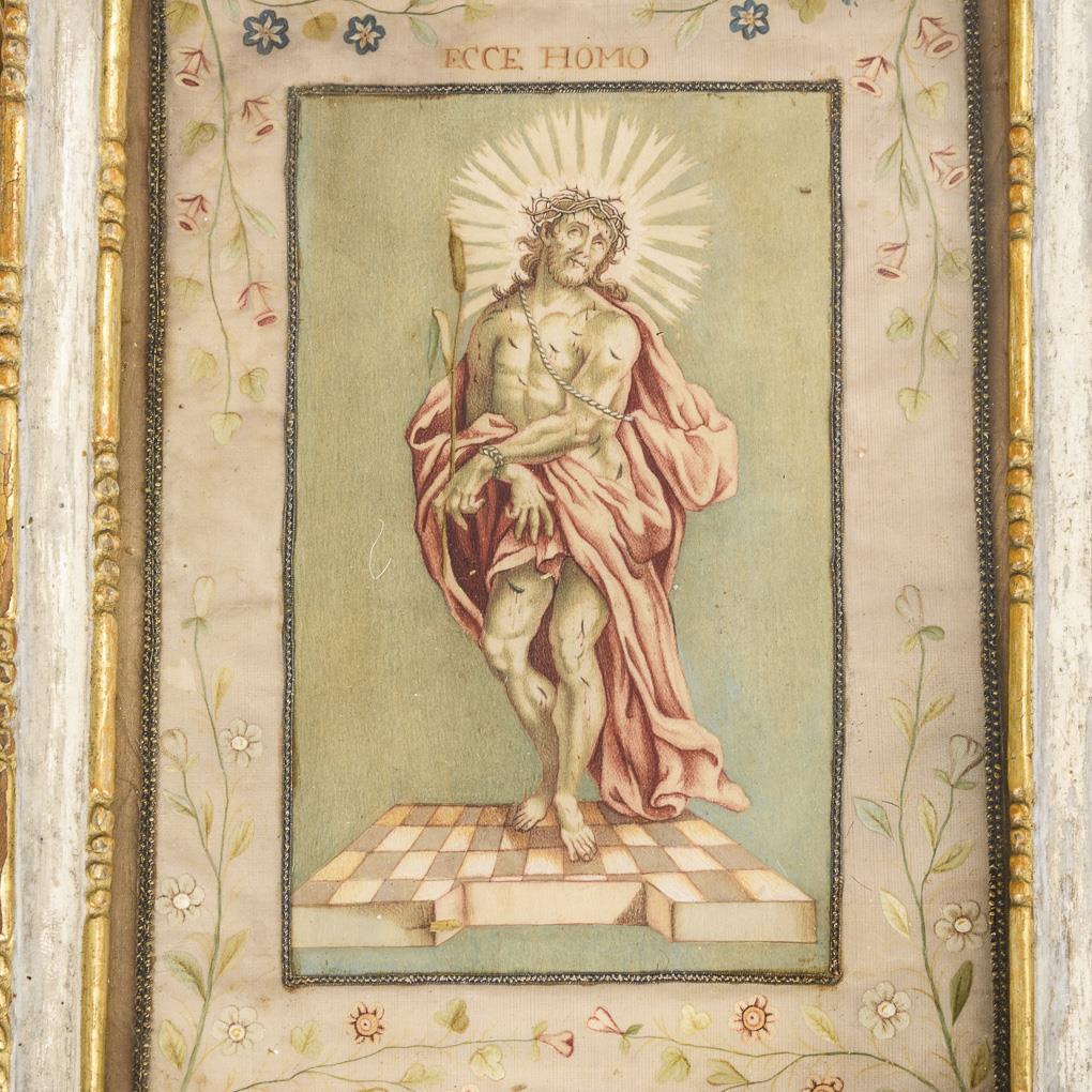 Christus im Elend, "Ecce Homo" bzw. betende Maria. Je florale bzw. ornamentale Rahmung sowie verglaste Rahmen (2x mit Schnitzerei). Fehlstellen und Klebespuren an den Rahmen, teils stärkere Alters-/Gebrauchsspuren.