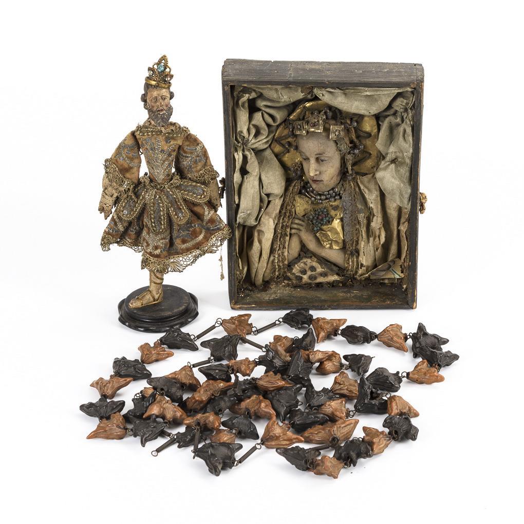 Defekte barocke Krippenfigur (Melchior?) mit Holzkörper und -Gliedmaßen sowie Drahtarbeit-Stickerei auf Samt. / Wachsbossierung mit Drahtarbeit, Glasperlen und Stoff im Holzkasten. / Großer Rosenkranz aus Wassernüssen. Fehlteile und Defekte.