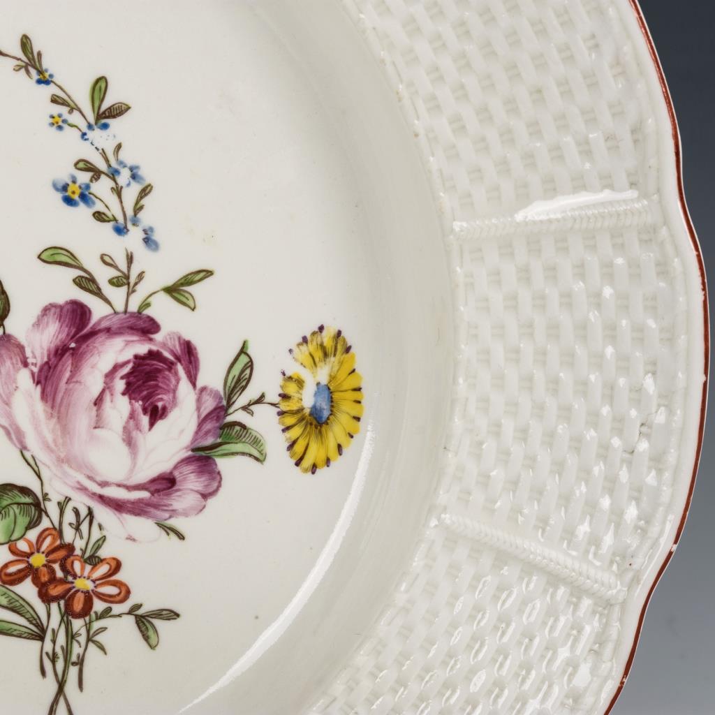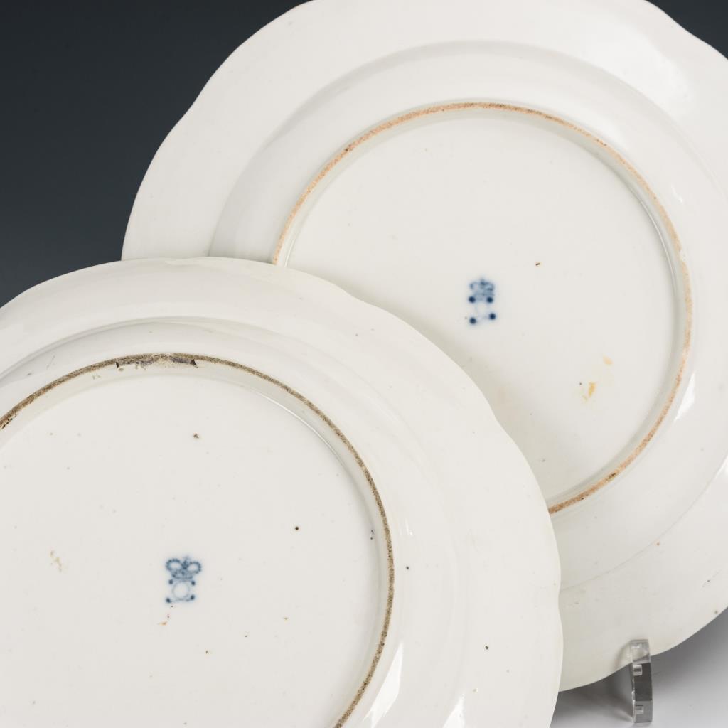 Suppenteller (Durchmesser ca. 24,5 cm) und Speiseteller (Durchmesser ca. 25,5 cm) mit Altozierrelief und braunem Rand. Rand etwas berieben, Brandfleck am Speisetellerrand, Bestoßungen an den Standringen.
