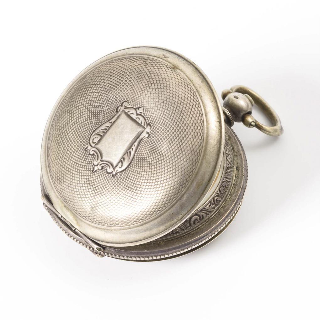 Guillochiertes Sprungdeckelgehäuse mit leerer Wappenkartusche. Alters- und Gebrauchsspuren, Gehäuse schließt nicht, Defekte an Zifferblatt und Gehäuse.