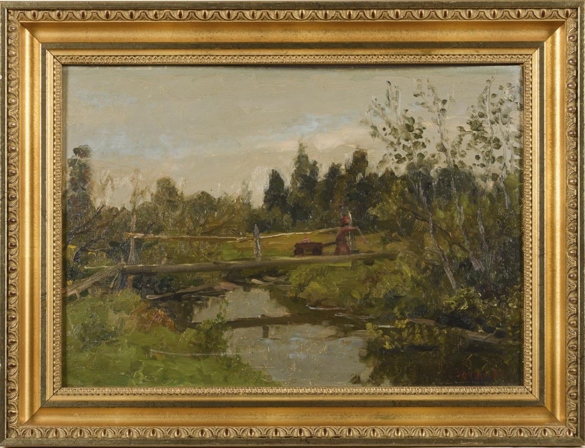 Russischer Maler: Flusslandschaft mit Brücke
