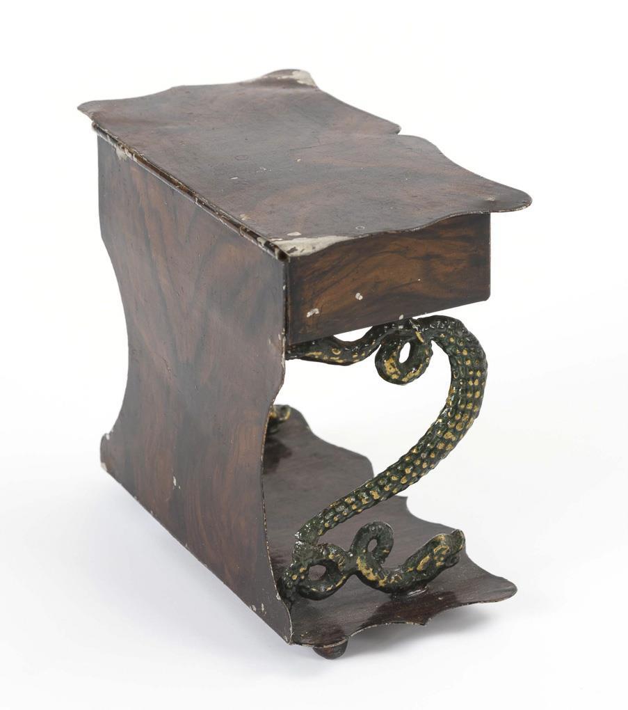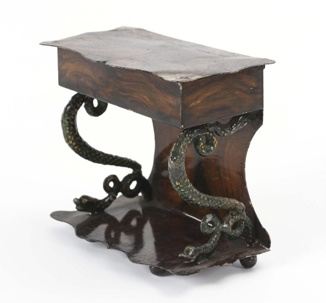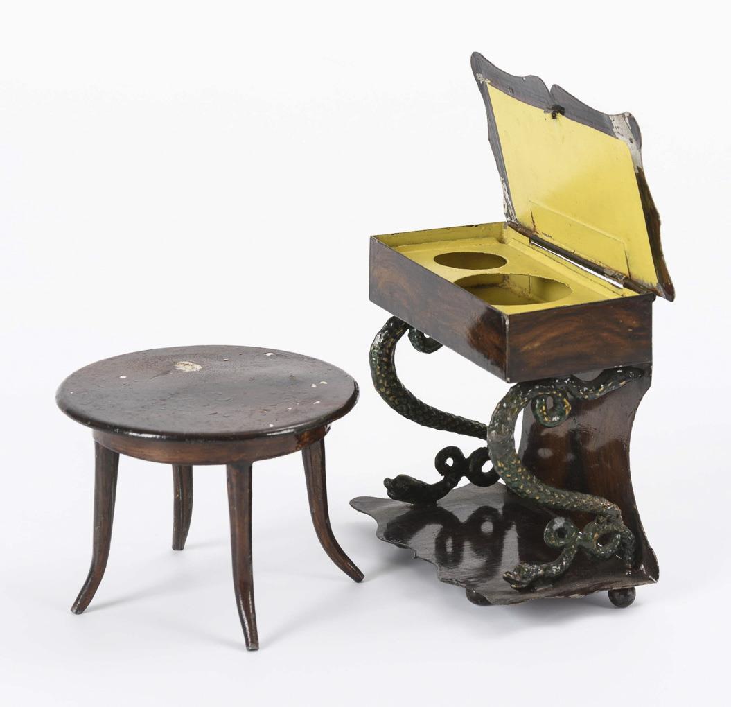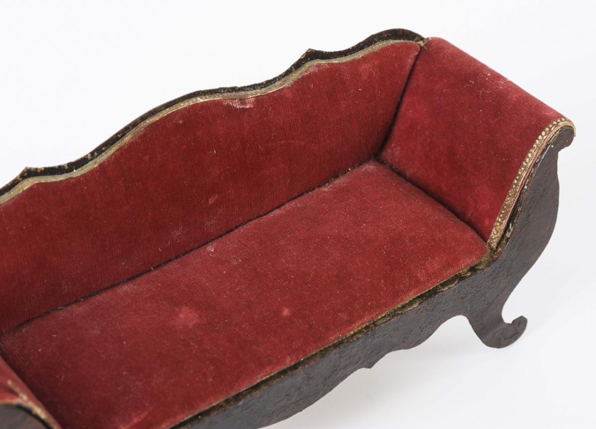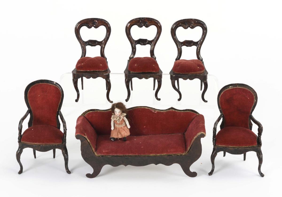 Eleganter Wandtisch mit Schlangenbeinen und aufklappbarer Deckplatte, Sofa mit weinroter Polsterung, 5 passende Stühle und runder Tisch. Dazu kleines Püppchen. Mit Defekten und Überarbeitungen (Schlangenfüße des Tischchens angebrochen, Lehne des Sofas beschnitten).
