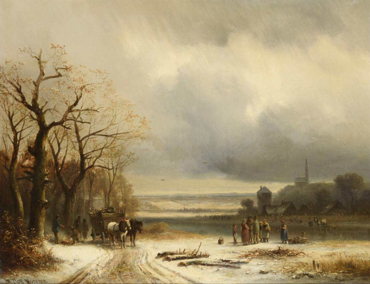 Viele Menschen auf dem gefrorenen Fluss und am Waldrand nahe der Stadt bei bewölktem Himmel. Leinwand doubliert.