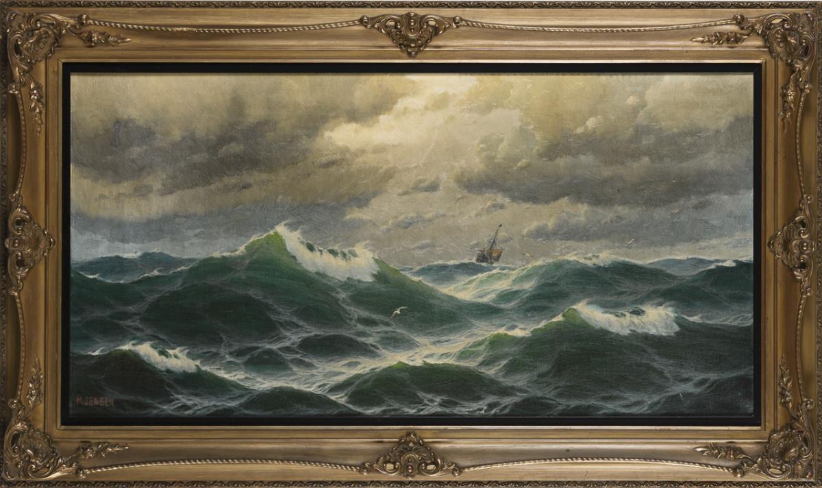 Hohe Wellen mit kleinem Segler unter grauem, bewölktem Himmel. Ein Defekt, eine restaurierte Stelle mit Hinterklebung.