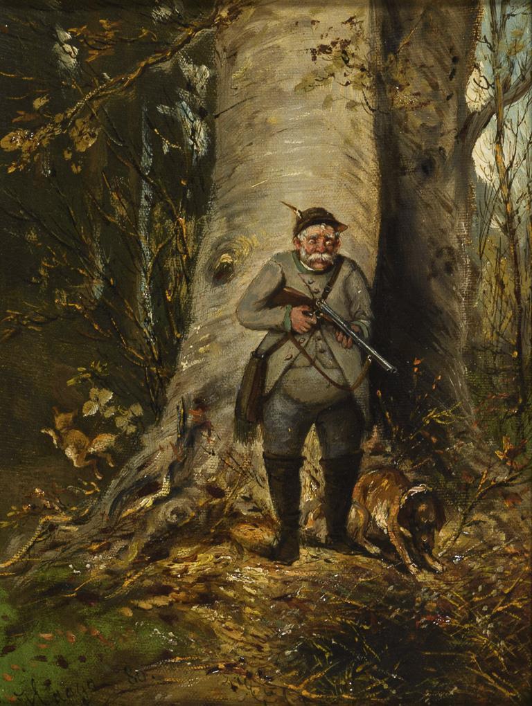 Erschrocken am Fuchsbau stehender Jäger mit Hund bzw. Schlafender Jäger an einem Baum.