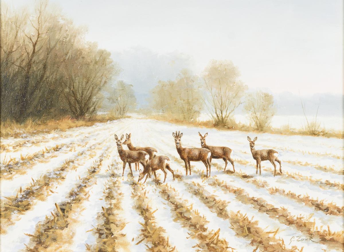 Rehe auf verschneitem Feld am Waldrand, Wildschweine im Winterwald und zwei Birkhähne in karger Landschaft.