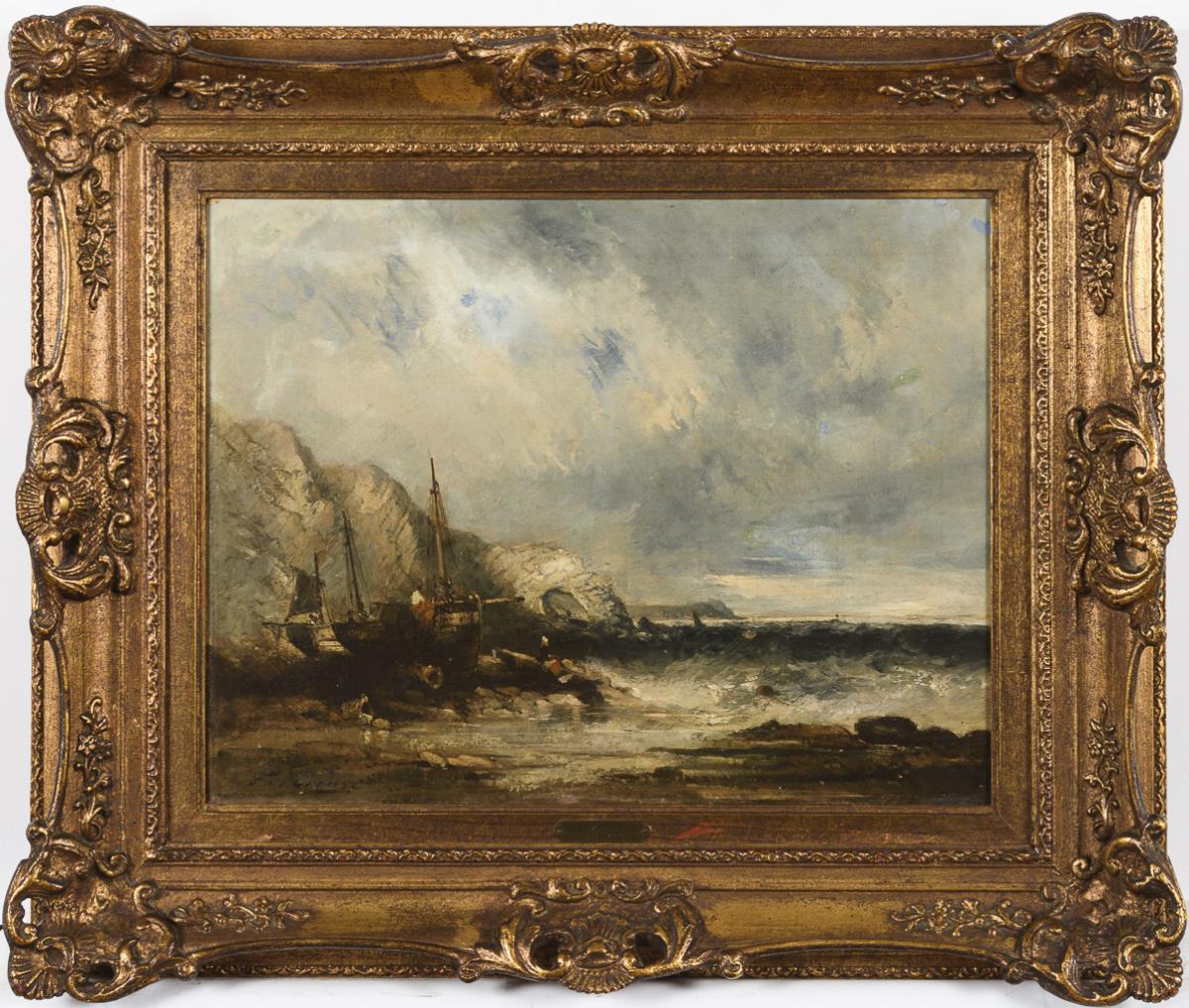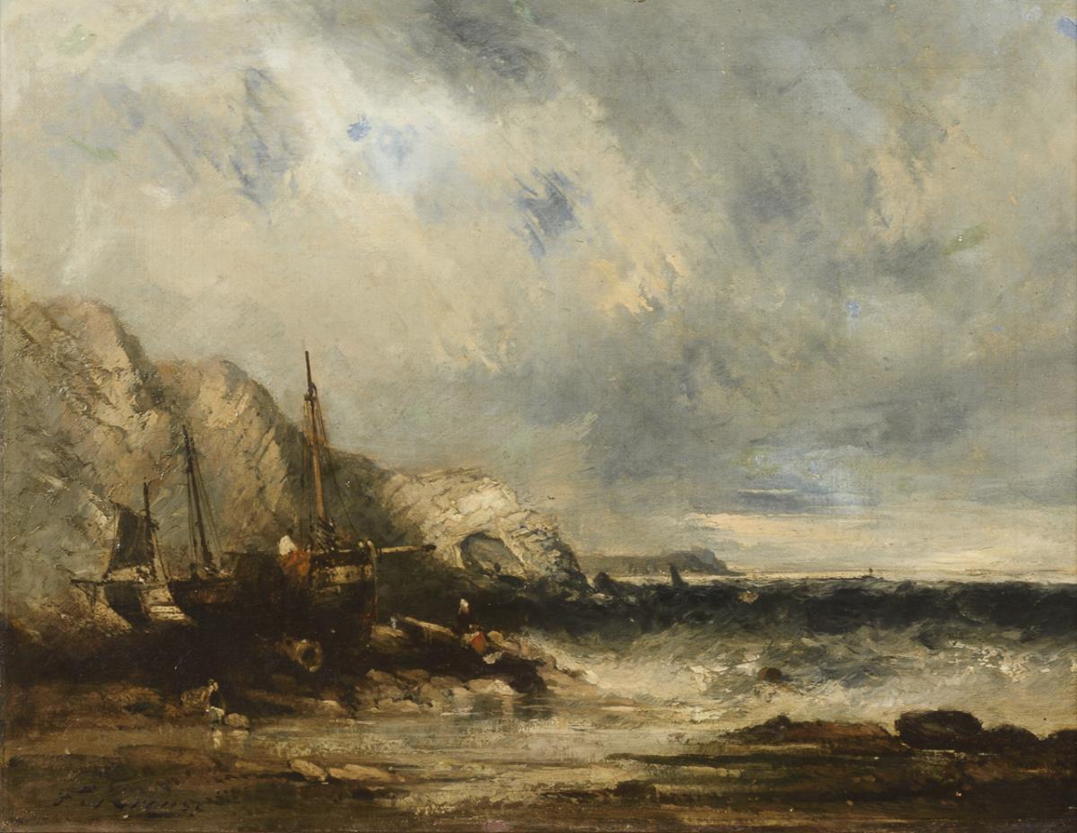 Stürmische Steilküste mit den Fischern am Strand auf dem Boot unter wolkigem Himmel. Altersspuren.