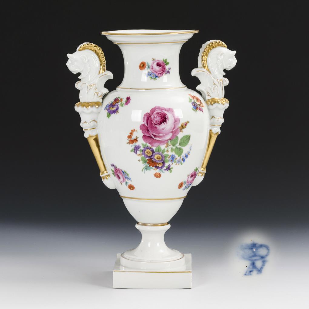 Löwenkopfvase mit Blumendekor. Aelteste Volkstedter.
