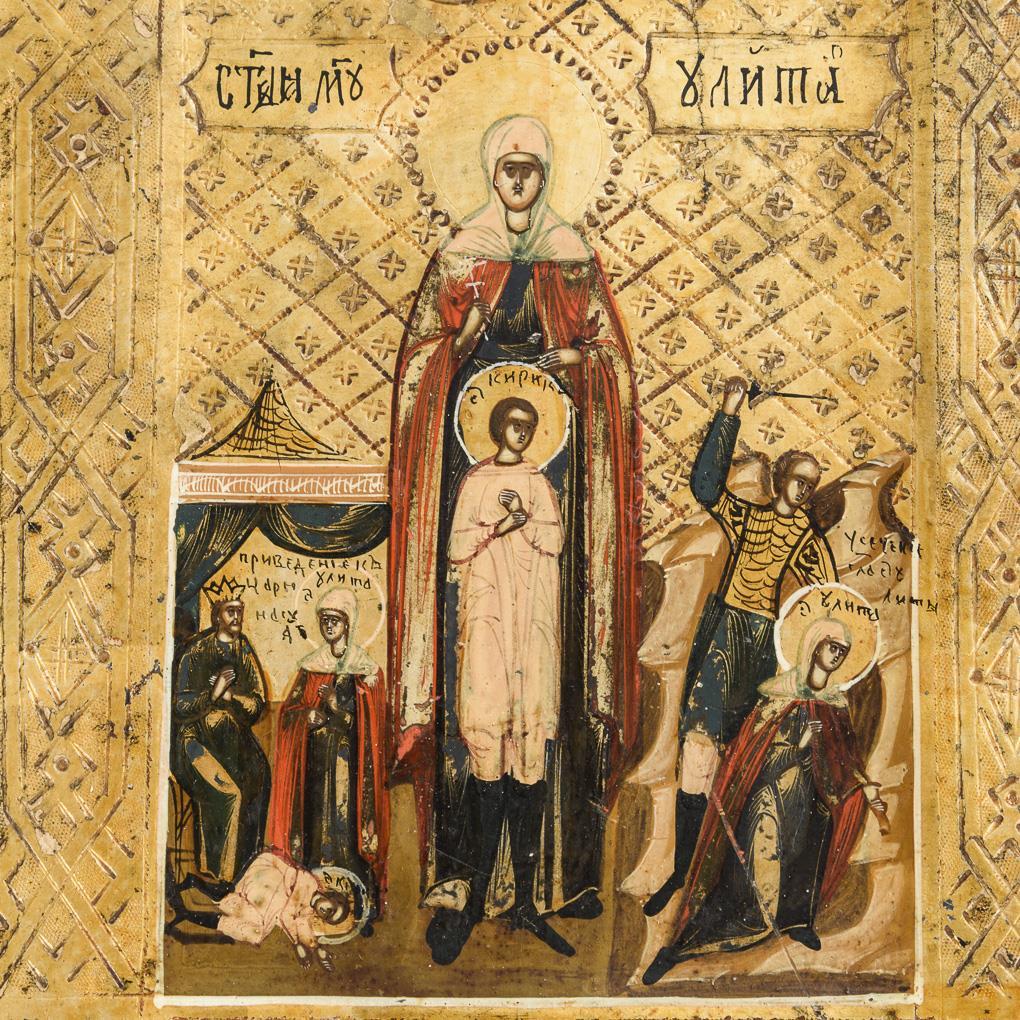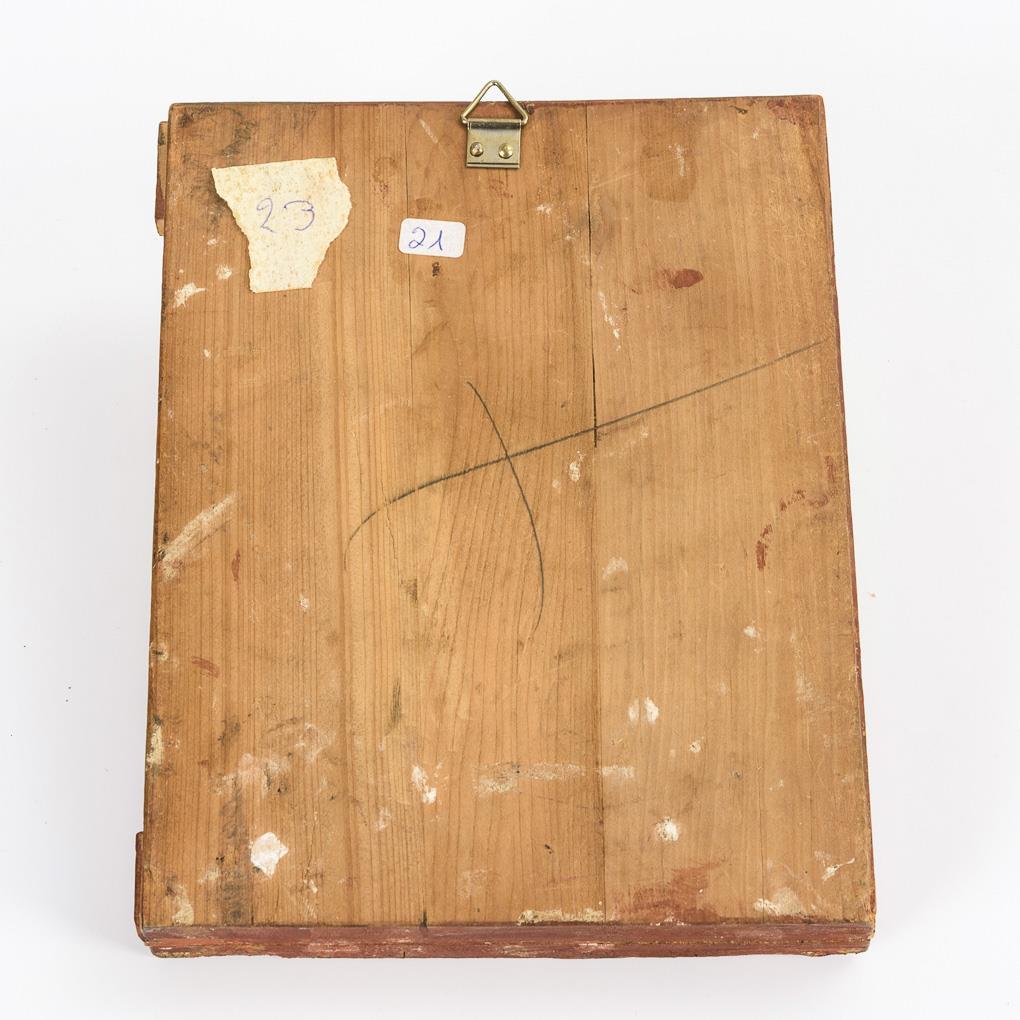 Stehende Maria mit dem Jesusknaben, flankiert von Szene aus ihrem Leben. Altersspuren.