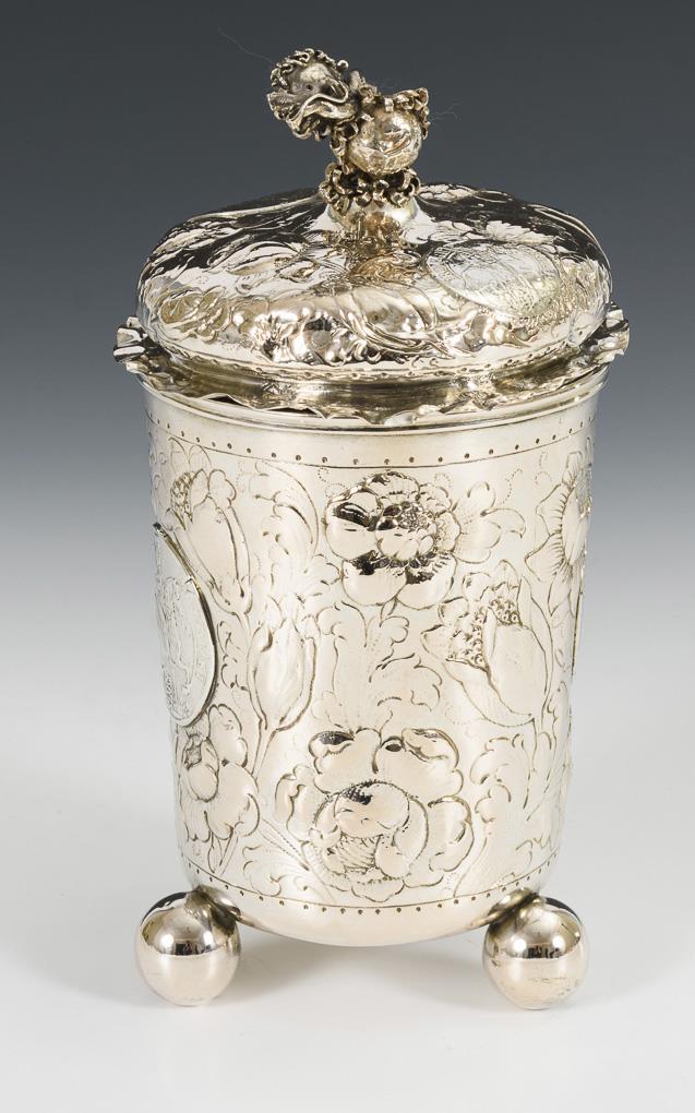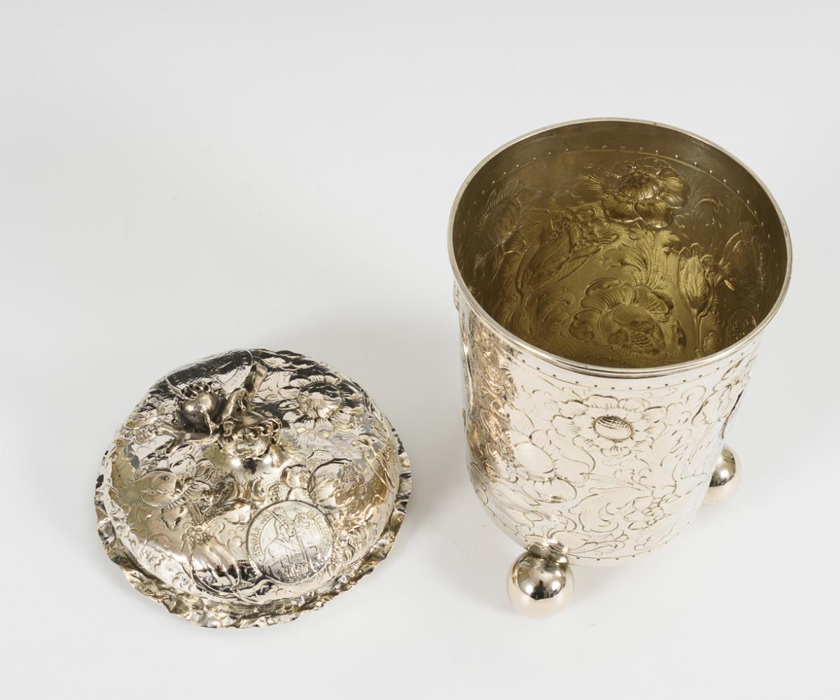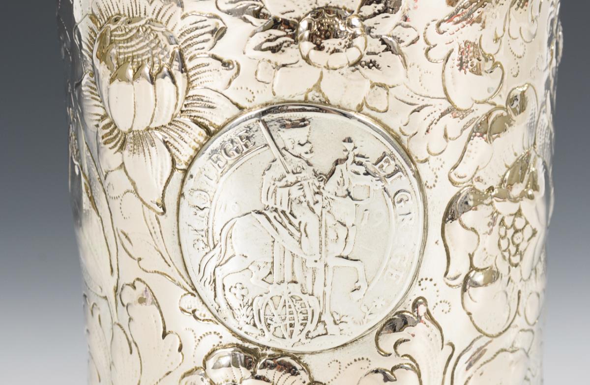 Seltener Münzbecher mit 4 eingelegten Vikariatsmünzen Johann Georgs II. von Sachsen aus den Jahren 1657 und 1658. Oberfläche der Münzen und Punzen verputzt.