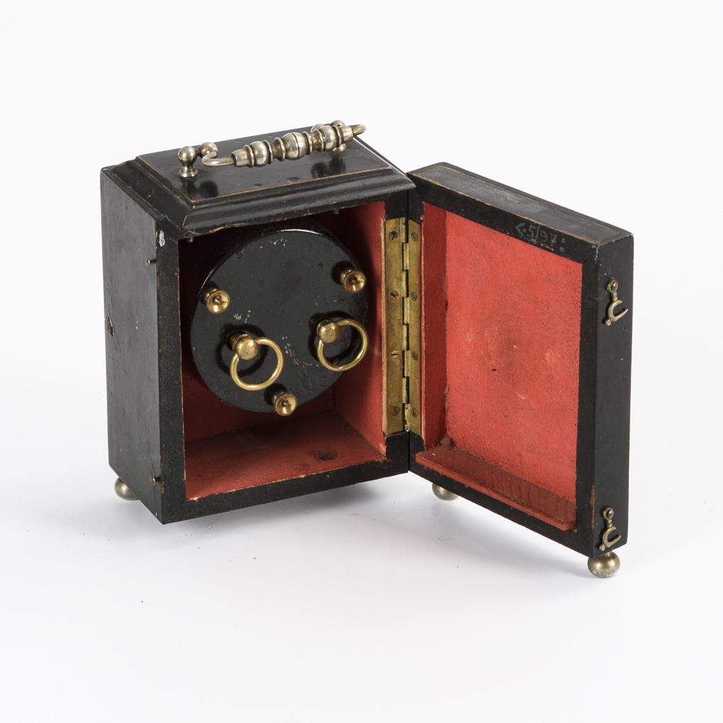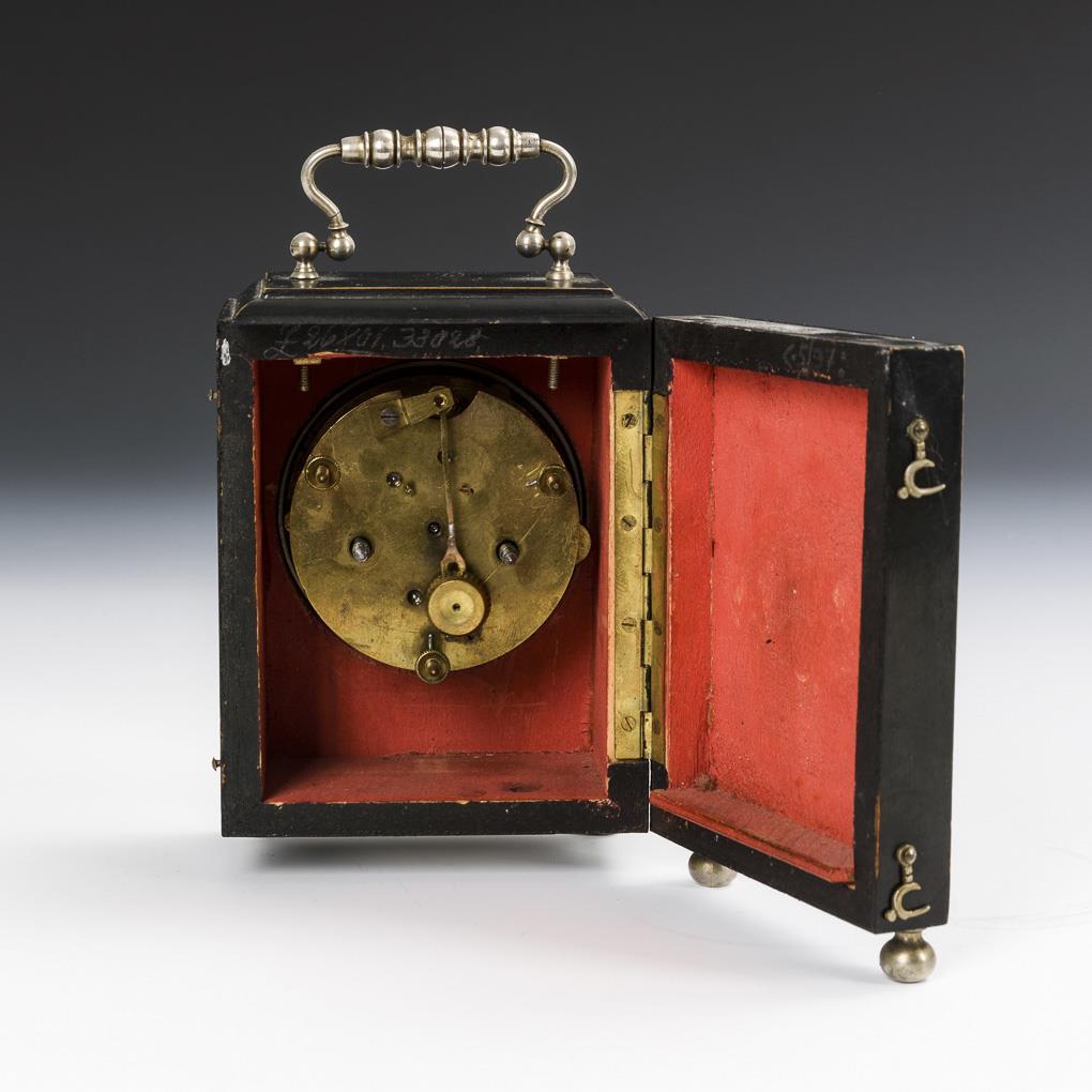 Federwerk mit Handaufzug, Ankergang und Kuhschwanzpendel, Alarmfunktion mit Schlag auf Metallabdeckung. Geh- und Schlagwerk laufen. Weißes Emailzifferblatt mit römischen und arabischen Zahlen, Minutenkranz, wohl teils ergänzten Zeigern und langem Alarmzeiger.