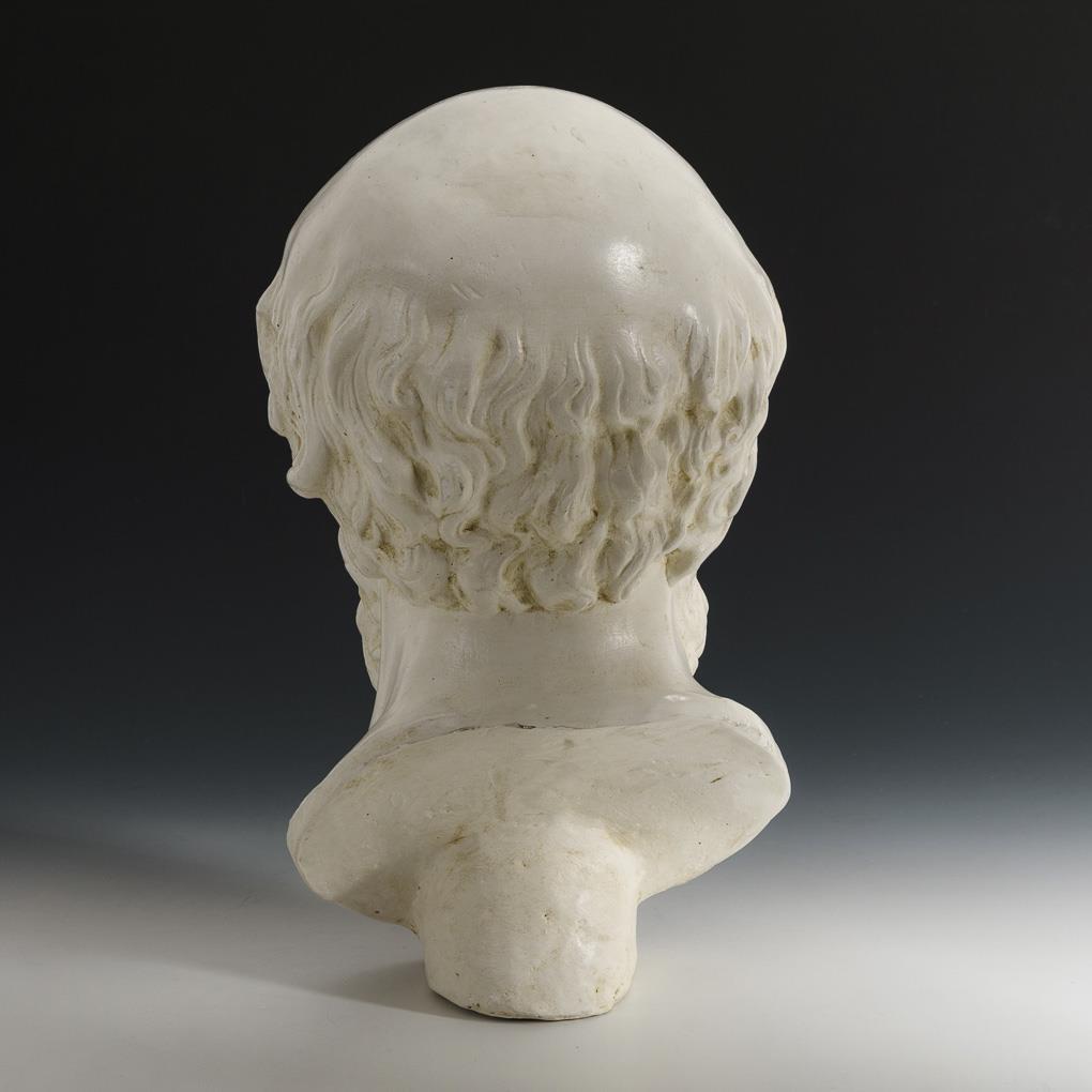 Leicht überlebensgroßes Bildnis des antiken Philosophen. Abplatzer am Büstenschnitt, einige Alters-/Gebrauchsspuren.