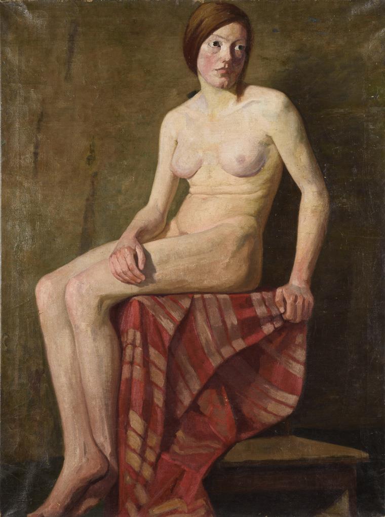 Ganzfiguriges Bildnis einer junge nackten Frau auf einem mit einer gestreiften Decke drapiertem Podest im Atelier des Künstlers. Altersspuren, Farbabsplitterungen.