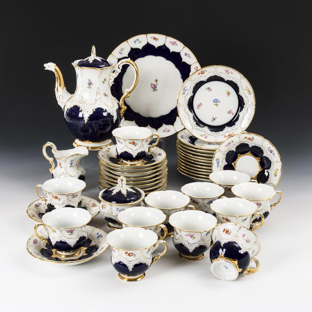 40 Teile. Kaffeekanne (H 25 cm), Milchkännchen, Zuckerdose, 12 Kaffeetassen, 12 Untertassen, 12 Frühstücksteller und 1 Kuchenteller (dieser in "X-Form", Ø 28 cm).