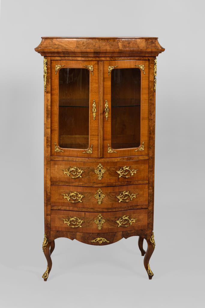 Vitrinenschrank im Stil des Dresdener Barock mit verglaster Doppeltür und 3 Schüben, verziert mit üppigen Messing-Applikationen; innen 1 Einlegeboden aus Glas. Trockenrisse, Alters-/Gebrauchsspuren.