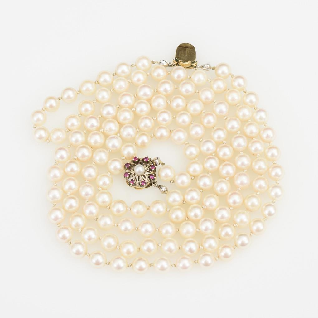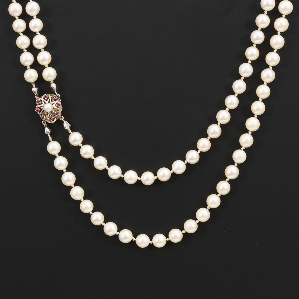 Schnürketten mit 128 Zuchtperlen in Einzelverknotung. Zierschließe mit 8 kleinen Rubinen und Mittelperle.