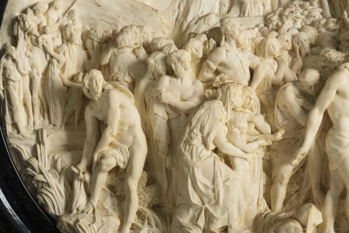 Hochrelief mit der außerordentlich figurenreichen Darstellung. 1 Arm geklebt, Trockenriss und minimale Lackschäden am Rahmen.