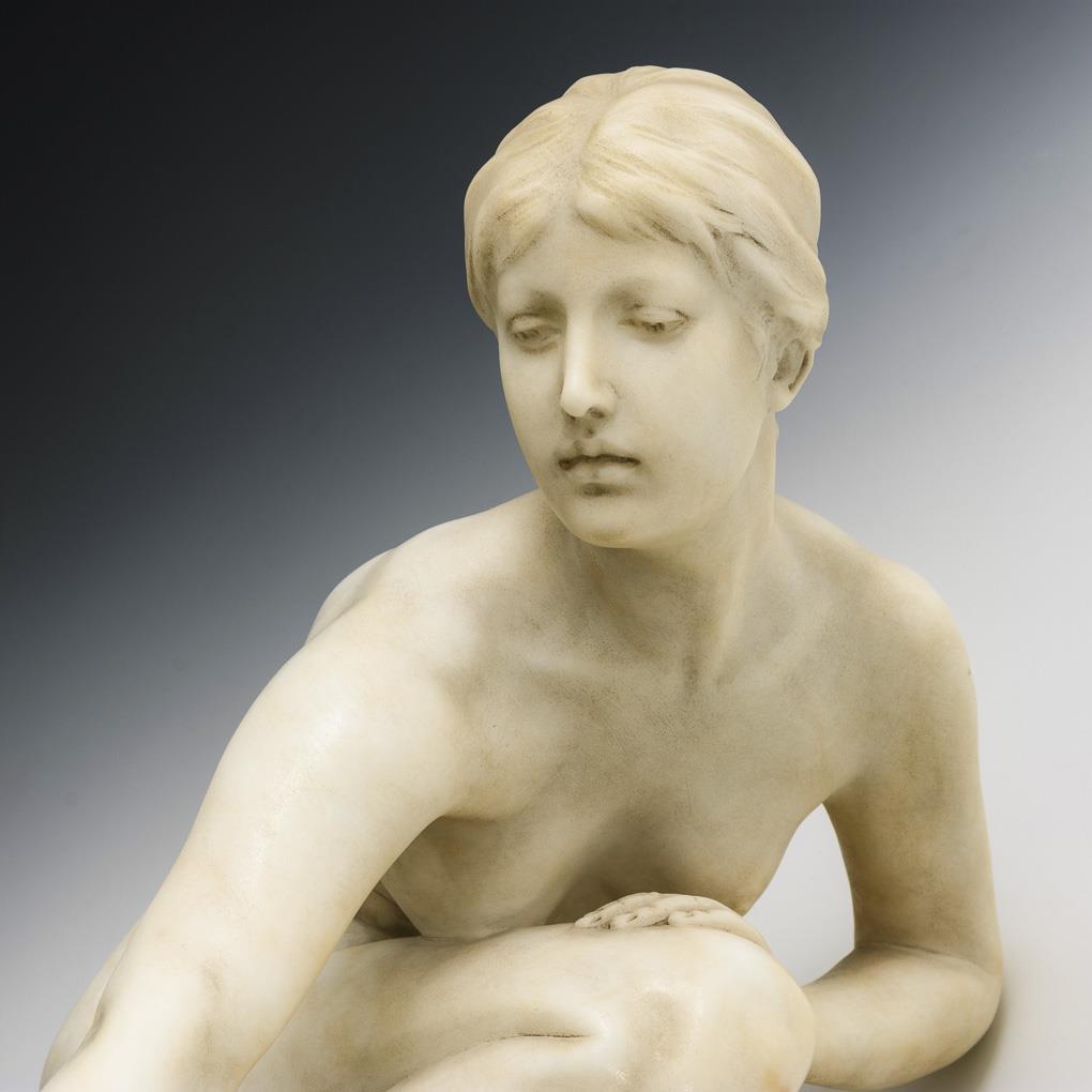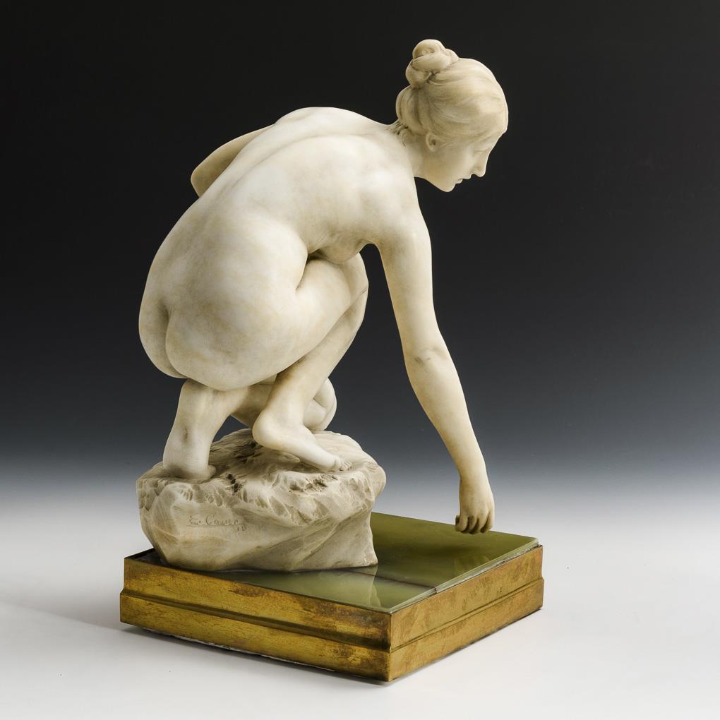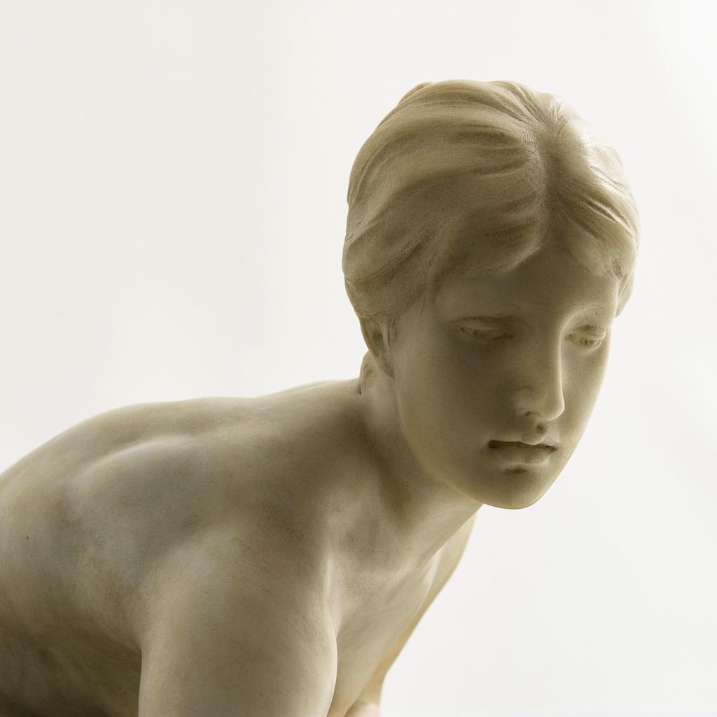 Kniender Akt einer jungen Frau, die sich zum Wasser niederbeugt. Fehlteile an der Schale, Plinthe gerissen, sonst minimale Alters-/Gebrauchsspuren.