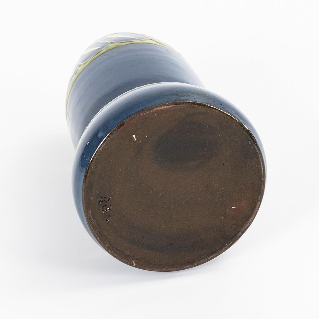 Steingut, blau und braun glasiert, grüne und weiße Schlickerbemalung mit Wellenendekor. H 24 cm.
