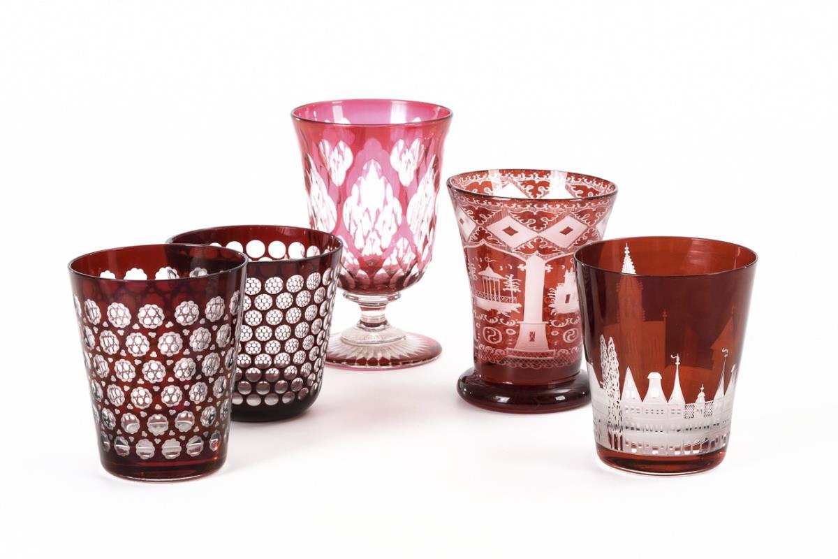 2 konische Becher mit Linsenschliff. /1 konischer Becher mit gravierter, teils geblänkter Stadtansicht. / 1 Kraterbecher mit gravierten Ornamenten und Architektur. / 1 Fußbecher mit Schliffdekor und Bodenstern.