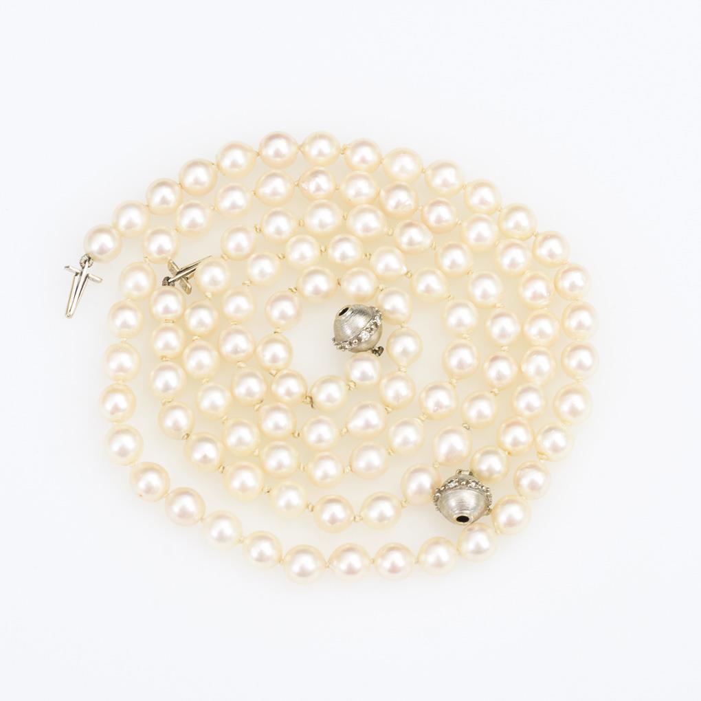 2 Schnürketten mit 50 und 54 Zuchtperlen in Einzelverknotung, an Kugelschließen mit je 5 eingelassenen Diamanten. Auch als lange Kette tragbar.